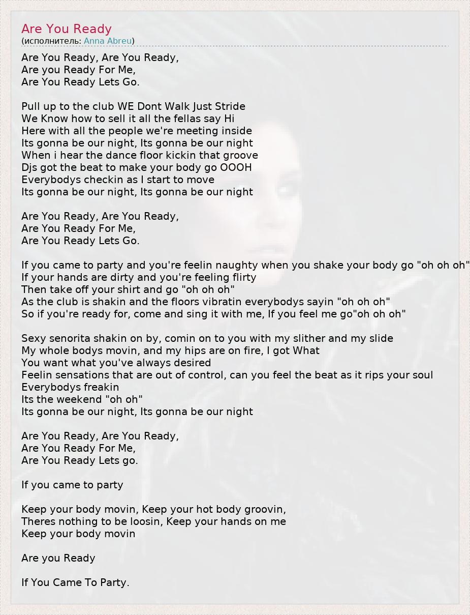 Are You Ready, Are You Ready, Are you Ready For Me, Are You Ready Lets Go. Pull up to the club WE Dont Walk Just Stride We Know how to sell it all the fellas say Hi Here with all the people we're meeting inside Its gonna be our night, Its gonna be our night When i hear the dance floor kickin that groove Djs got the beat to make your body go OOOH Everybodys checkin as I start to move Its gonna be our night, Its gonna be our night Are You Ready, Are You Ready, Are You Ready For Me, Are You Ready Lets Go. If you came to party and you're feelin naughty when you shake your body go "oh oh oh" If your hands are dirty and you're feeling flirty Then take off your shirt and go "oh oh oh" As the club is shakin and the floors vibratin everybodys sayin "oh oh oh" So if you're ready for, come and sing it with me, If you feel me go"oh oh oh" Sexy senorita shakin on by, comin on to you with my slither and my slide My whole bodys movin, and my hips are on fire, I got What You want what you've always desired Feelin sensations that are out of control, can you feel the beat as it rips your soul Everybodys freakin Its the weekend "oh oh" Its gonna be our night, Its gonna be our night Are You Ready, Are You Ready, Are You Ready For Me, Are You Ready Lets go. If you came to party Keep your body movin, Keep your hot body groovin, Theres nothing to be loosin, Keep your hands on me Keep your body movin Are you Ready If You Came To Party.