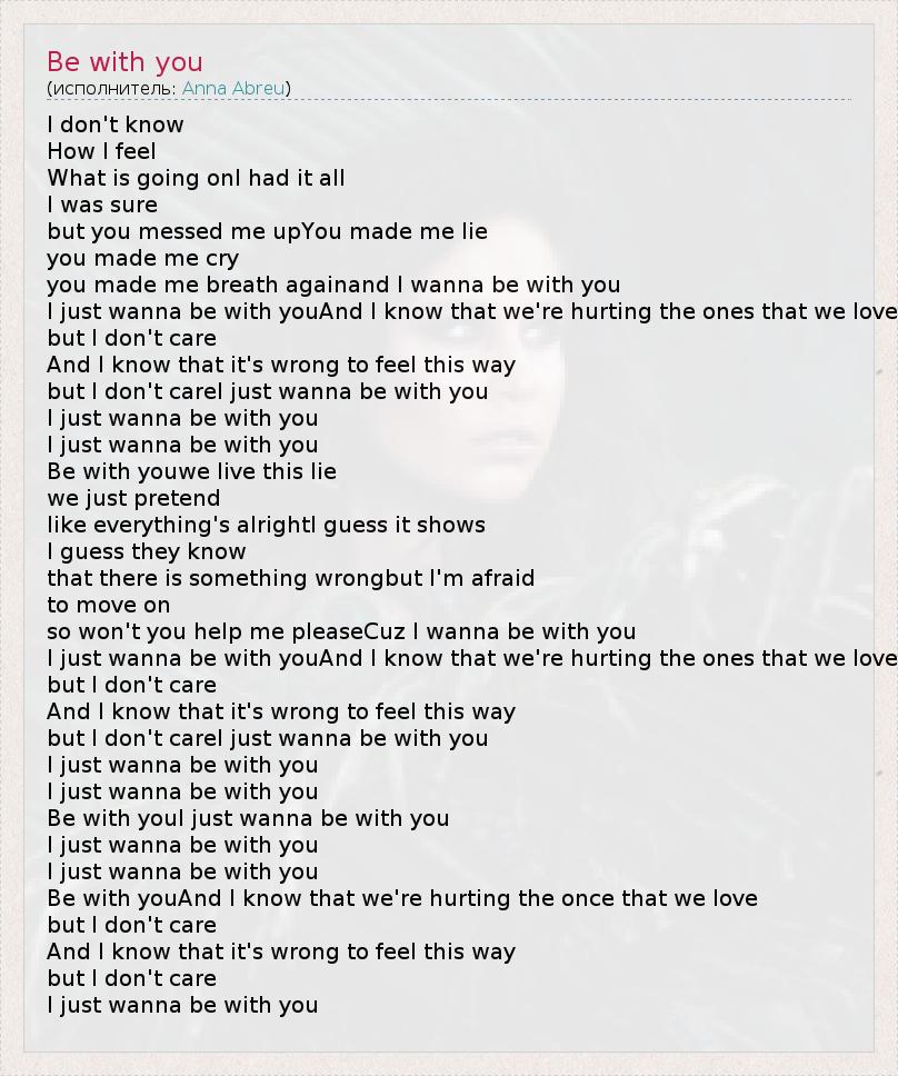 I don't know How I feel What is going onI had it all I was sure but you messed me upYou made me lie you made me cry you made me breath againand I wanna be with you I just wanna be with youAnd I know that we're hurting the ones that we love but I don't care And I know that it's wrong to feel this way but I don't careI just wanna be with you I just wanna be with you I just wanna be with you Be with youwe live this lie we just pretend like everything's alrightI guess it shows I guess they know that there is something wrongbut I'm afraid to move on so won't you help me pleaseCuz I wanna be with you I just wanna be with youAnd I know that we're hurting the ones that we love but I don't care And I know that it's wrong to feel this way but I don't careI just wanna be with you I just wanna be with you I just wanna be with you Be with youI just wanna be with you I just wanna be with you I just wanna be with you Be with youAnd I know that we're hurting the once that we love but I don't care And I know that it's wrong to feel this way but I don't care I just wanna be with you