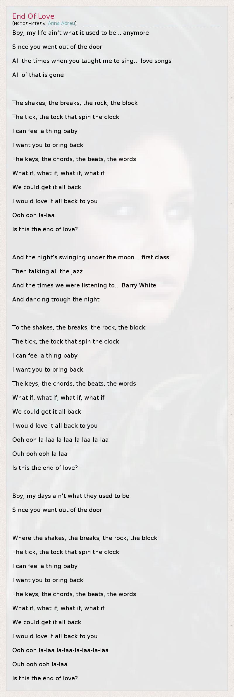 Boy, my life ain't what it used to be... anymore Since you went out of the door All the times when you taught me to sing... love songs All of that is gone The shakes, the breaks, the rock, the block The tick, the tock that spin the clock I can feel a thing baby I want you to bring back The keys, the chords, the beats, the words What if, what if, what if, what if We could get it all back I would love it all back to you Ooh ooh la-laa Is this the end of love? And the night's swinging under the moon... first class Then talking all the jazz And the times we were listening to... Barry White And dancing trough the night To the shakes, the breaks, the rock, the block The tick, the tock that spin the clock I can feel a thing baby I want you to bring back The keys, the chords, the beats, the words What if, what if, what if, what if We could get it all back I would love it all back to you Ooh ooh la-laa la-laa-la-laa-la-laa Ouh ooh ooh la-laa Is this the end of love? Boy, my days ain't what they used to be Since you went out of the door Where the shakes, the breaks, the rock, the block The tick, the tock that spin the clock I can feel a thing baby I want you to bring back The keys, the chords, the beats, the words What if, what if, what if, what if We could get it all back I would love it all back to you Ooh ooh la-laa la-laa-la-laa-la-laa Ouh ooh ooh la-laa Is this the end of love?