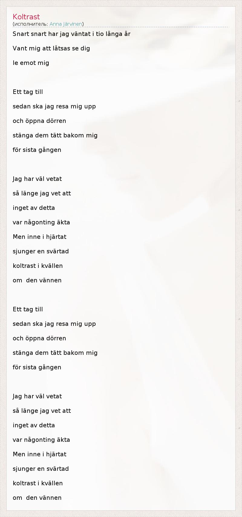 Snart snart har jag väntat i tio långa år Vant mig att låtsas se dig le emot mig Ett tag till sedan ska jag resa mig upp och öppna dörren stänga dem tätt bakom mig för sista gången Jag har väl vetat så länge jag vet att inget av detta var någonting äkta Men inne i hjärtat sjunger en svärtad koltrast i kvällen om den vännen Ett tag till sedan ska jag resa mig upp och öppna dörren stänga dem tätt bakom mig för sista gången Jag har väl vetat så länge jag vet att inget av detta var någonting äkta Men inne i hjärtat sjunger en svärtad koltrast i kvällen om den vännen