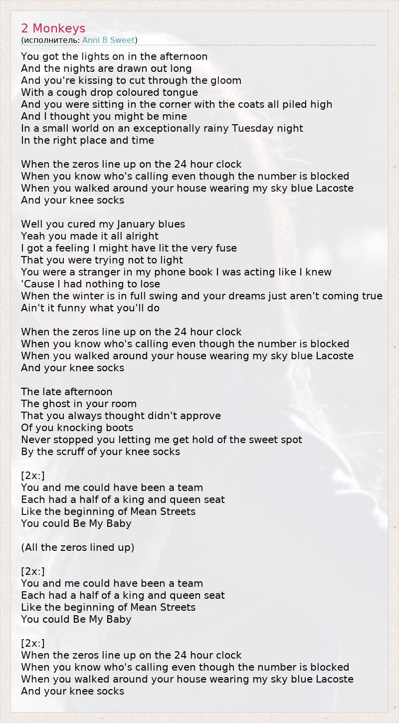 You got the lights on in the afternoon And the nights are drawn out long And you're kissing to cut through the gloom With a cough drop coloured tongue And you were sitting in the corner with the coats all piled high And I thought you might be mine In a small world on an exceptionally rainy Tuesday night In the right place and time When the zeros line up on the 24 hour clock When you know who's calling even though the number is blocked When you walked around your house wearing my sky blue Lacoste And your knee socks Well you cured my January blues Yeah you made it all alright I got a feeling I might have lit the very fuse That you were trying not to light You were a stranger in my phone book I was acting like I knew 'Cause I had nothing to lose When the winter is in full swing and your dreams just aren't coming true Ain't it funny what you'll do When the zeros line up on the 24 hour clock When you know who's calling even though the number is blocked When you walked around your house wearing my sky blue Lacoste And your knee socks The late afternoon The ghost in your room That you always thought didn't approve Of you knocking boots Never stopped you letting me get hold of the sweet spot By the scruff of your knee socks [2x:] You and me could have been a team Each had a half of a king and queen seat Like the beginning of Mean Streets You could Be My Baby (All the zeros lined up) [2x:] You and me could have been a team Each had a half of a king and queen seat Like the beginning of Mean Streets You could Be My Baby [2x:] When the zeros line up on the 24 hour clock When you know who's calling even though the number is blocked When you walked around your house wearing my sky blue Lacoste And your knee socks