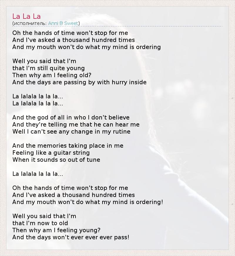 О руки времени не остановит меня И я спросилтысячи сто раз И мой рот не будет делать то, что мой ум заказе Ну ты сказал, что я что я еще совсем молодой Тогда почему я чувствую себя старой ? И дни проходят мимо с торопятся внутри La Лалала ла -ла-ла ... La Лалала ла -ла-ла ... Ибог все , кого я не верю, И они говорят мне, что он может услышать меня Ну, я не вижу каких-либо изменений в моей rutine И воспоминания происходит во мне Чувствуя, как гитарная струна Когда он звучит так фальшиво La Лалала ла -ла-ла ... О руки времени не остановит меня И я спросилтысячи сто раз И мой рот не будет делать то, что мой ум приказывать! Ну ты сказал, что я что я сейчас старый Тогда почему я чувствую себя молодым? И дни никогда не будет когда-либо когда-либо пройти!