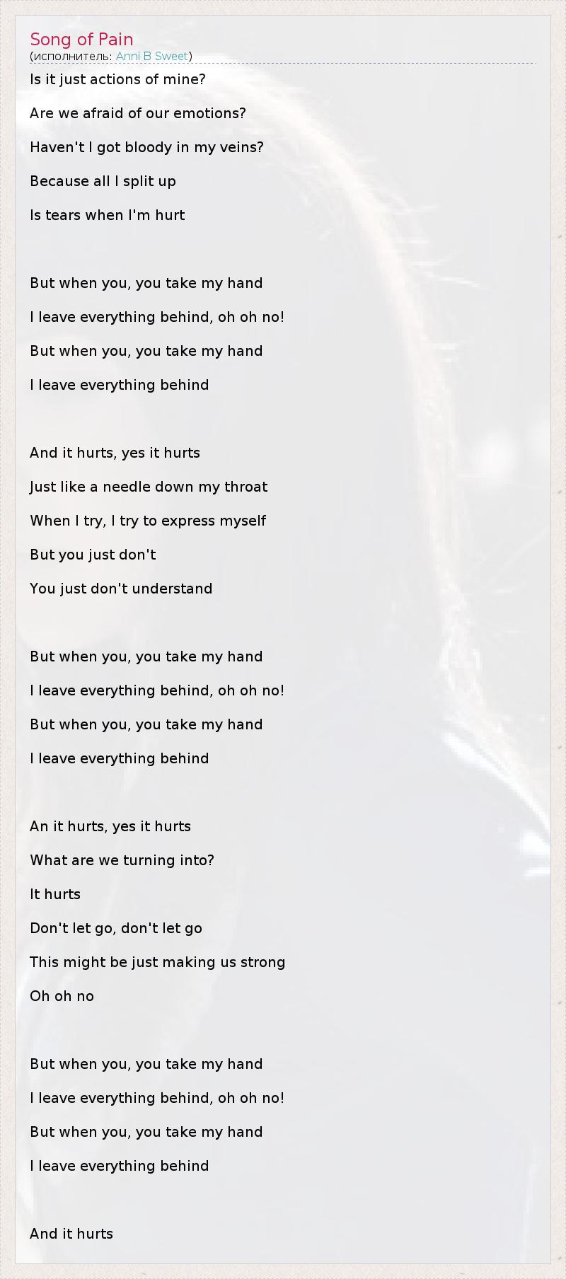 Is it just actions of mine? Are we afraid of our emotions? Haven't I got bloody in my veins? Because all I split up Is tears when I'm hurt But when you, you take my hand I leave everything behind, oh oh no! But when you, you take my hand I leave everything behind And it hurts, yes it hurts Just like a needle down my throat When I try, I try to express myself But you just don't You just don't understand But when you, you take my hand I leave everything behind, oh oh no! But when you, you take my hand I leave everything behind An it hurts, yes it hurts What are we turning into? It hurts Don't let go, don't let go This might be just making us strong Oh oh no But when you, you take my hand I leave everything behind, oh oh no! But when you, you take my hand I leave everything behind And it hurts