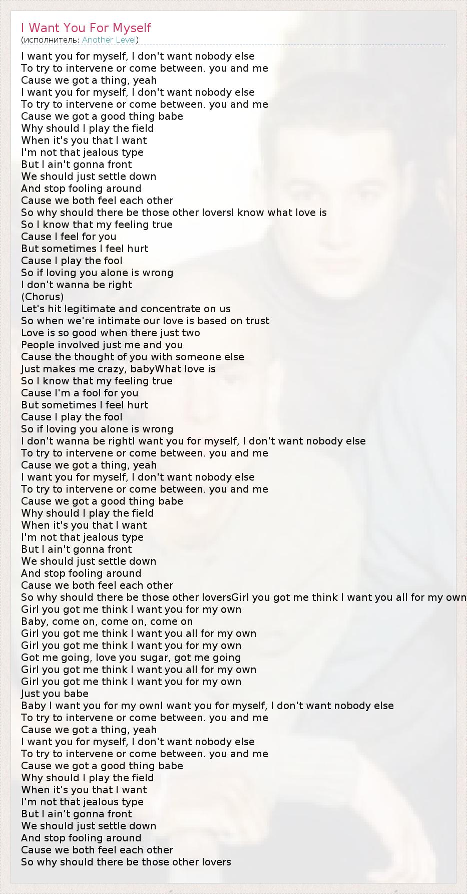 I want you for myself, I don't want nobody else To try to intervene or come between. you and me Cause we got a thing, yeah I want you for myself, I don't want nobody else To try to intervene or come between. you and me Cause we got a good thing babe Why should I play the field When it's you that I want I'm not that jealous type But I ain't gonna front We should just settle down And stop fooling around Cause we both feel each other So why should there be those other loversI know what love is So I know that my feeling true Cause I feel for you But sometimes I feel hurt Cause I play the fool So if loving you alone is wrong I don't wanna be right (Chorus) Let's hit legitimate and concentrate on us So when we're intimate our love is based on trust Love is so good when there just two People involved just me and you Cause the thought of you with someone else Just makes me crazy, babyWhat love is So I know that my feeling true Cause I'm a fool for you But sometimes I feel hurt Cause I play the fool So if loving you alone is wrong I don't wanna be rightI want you for myself, I don't want nobody else To try to intervene or come between. you and me Cause we got a thing, yeah I want you for myself, I don't want nobody else To try to intervene or come between. you and me Cause we got a good thing babe Why should I play the field When it's you that I want I'm not that jealous type But I ain't gonna front We should just settle down And stop fooling around Cause we both feel each other So why should there be those other loversGirl you got me think I want you all for my own Girl you got me think I want you for my own Baby, come on, come on, come on Girl you got me think I want you all for my own Girl you got me think I want you for my own Got me going, love you sugar, got me going Girl you got me think I want you all for my own Girl you got me think I want you for my own Just you babe Baby I want you for my ownI want you for myself, I don't want nobody else To try to intervene or come between. you and me Cause we got a thing, yeah I want you for myself, I don't want nobody else To try to intervene or come between. you and me Cause we got a good thing babe Why should I play the field When it's you that I want I'm not that jealous type But I ain't gonna front We should just settle down And stop fooling around Cause we both feel each other So why should there be those other lovers