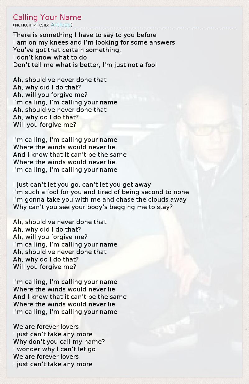 Зову тебя по имени Я кое-что хочу тебе сказать, перед тем как Я преклонюсь перед тобой, и я ищу некоторые ответы В тебе определенно что-то есть, я не знаю, что делать Не говори, что лучше, я ведь не дурак О, мне не стоило этого делать О, зачем я это сделал? О, ты простишь мне? Я зову, я зову тебя по имени О, мне не стоило этого делать О, зачем я это сделал? Я зову, я зову тебя по имени Где ветры никогда б не солгали И я знаю, что ничего не будет как прежде Там где ветры никогда б не солгали Я зову, я зову тебя по имени Я просто не могу отпустить тебя, не могу дать тебе исчезнуть Я испытываю к тебе такую страсть и уже устал быть лучшим во всём. Я хочу взять тебя с собой и разогнать тучи прочь Почему ты не видишь, твое тело просит меня остаться Мы любовники навсегда И я больше не могу вынести этого Почему ты не зовешь меня по имени Мне интересно, почему я не могу отпустить тебя