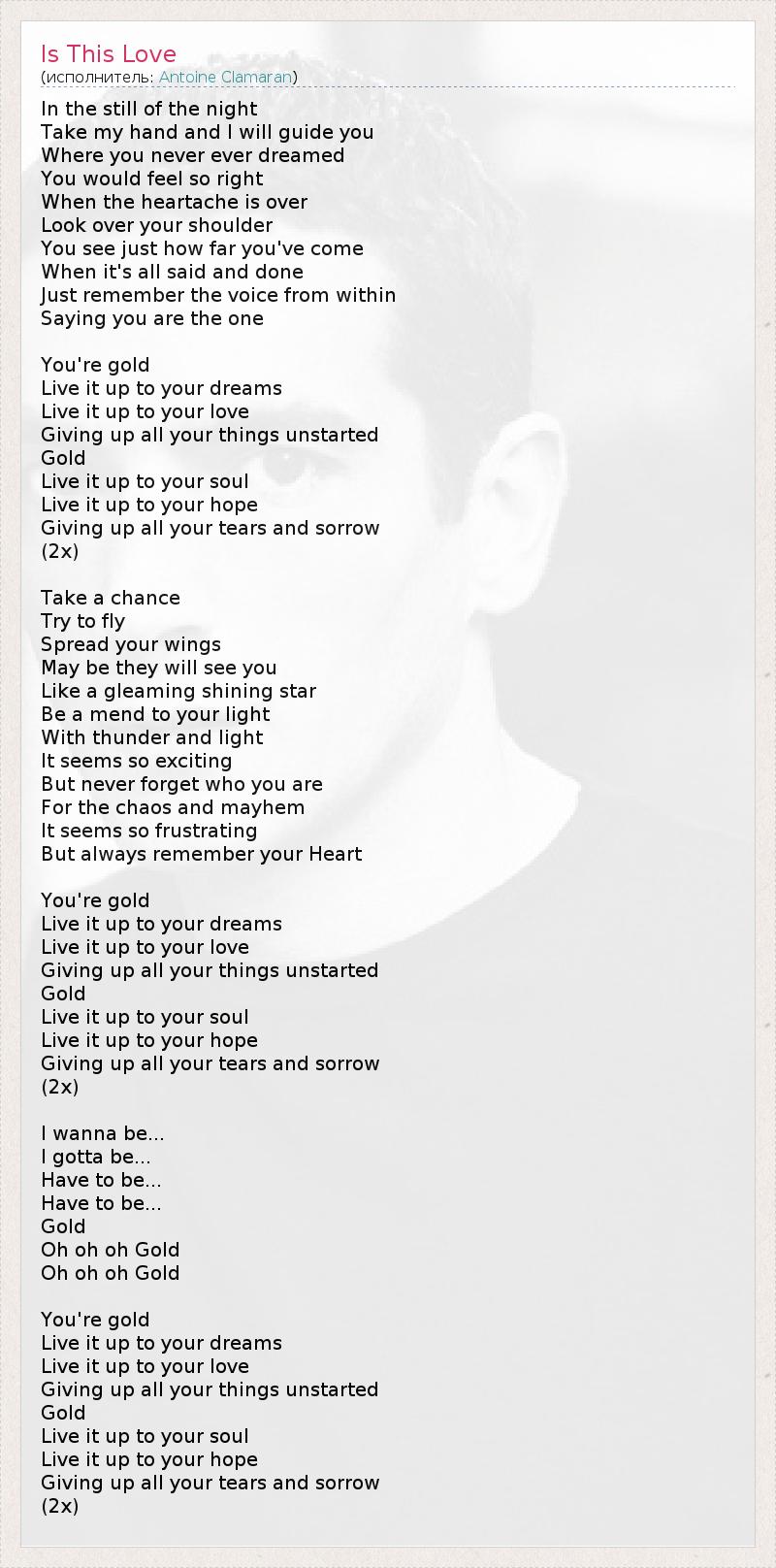 In the still of the night Take my hand and I will guide you Where you never ever dreamed You would feel so right When the heartache is over Look over your shoulder You see just how far you've come When it's all said and done Just remember the voice from within Saying you are the one You're gold Live it up to your dreams Live it up to your love Giving up all your things unstarted Gold Live it up to your soul Live it up to your hope Giving up all your tears and sorrow (2х) Take a chance Try to fly Spread your wings May be they will see you Like a gleaming shining star Be a mend to your light With thunder and light It seems so exciting But never forget who you are For the chaos and mayhem It seems so frustrating But always remember your Heart You're gold Live it up to your dreams Live it up to your love Giving up all your things unstarted Gold Live it up to your soul Live it up to your hope Giving up all your tears and sorrow (2х) I wanna be... I gotta be... Have to be... Have to be... Gold Oh oh oh Gold Oh oh oh Gold You're gold Live it up to your dreams Live it up to your love Giving up all your things unstarted Gold Live it up to your soul Live it up to your hope Giving up all your tears and sorrow (2х)