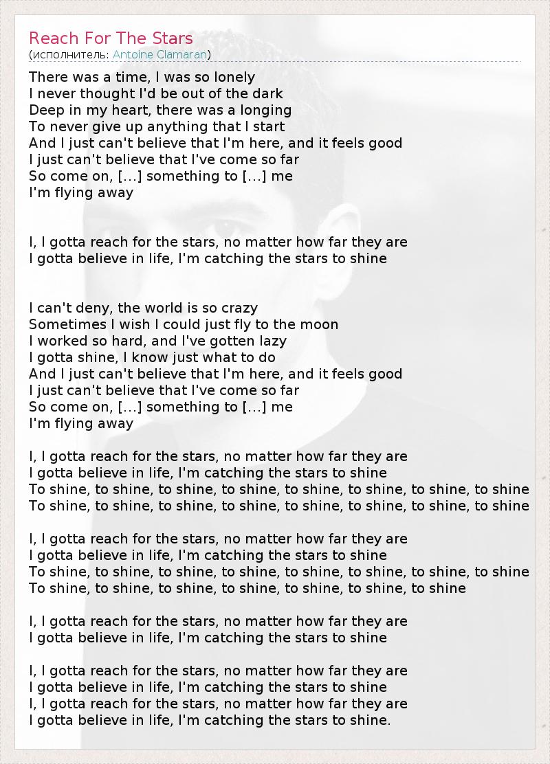 There was a time, I was so lonely I never thought I'd be out of the dark Deep in my heart, there was a longing To never give up anything that I start And I just can't believe that I'm here, and it feels good I just can't believe that I've come so far So come on, […] something to […] me I'm flying away I, I gotta reach for the stars, no matter how far they are I gotta believe in life, I'm catching the stars to shine I can't deny, the world is so crazy Sometimes I wish I could just fly to the moon I worked so hard, and I've gotten lazy I gotta shine, I know just what to do And I just can't believe that I'm here, and it feels good I just can't believe that I've come so far So come on, […] something to […] me I'm flying away I, I gotta reach for the stars, no matter how far they are I gotta believe in life, I'm catching the stars to shine To shine, to shine, to shine, to shine, to shine, to shine, to shine, to shine To shine, to shine, to shine, to shine, to shine, to shine, to shine, to shine I, I gotta reach for the stars, no matter how far they are I gotta believe in life, I'm catching the stars to shine To shine, to shine, to shine, to shine, to shine, to shine, to shine, to shine To shine, to shine, to shine, to shine, to shine, to shine, to shine I, I gotta reach for the stars, no matter how far they are I gotta believe in life, I'm catching the stars to shine I, I gotta reach for the stars, no matter how far they are I gotta believe in life, I'm catching the stars to shine I, I gotta reach for the stars, no matter how far they are I gotta believe in life, I'm catching the stars to shine.