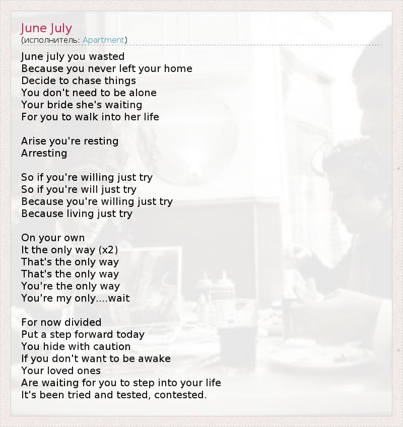June july you wasted Because you never left your home Decide to chase things You don't need to be alone Your bride she's waiting For you to walk into her life Arise you're resting Arresting So if you're willing just try So if you're will just try Because you're willing just try Because living just try On your own It the only way (x2) That's the only way That's the only way You're the only way You're my only....wait For now divided Put a step forward today You hide with caution If you don't want to be awake Your loved ones Are waiting for you to step into your life It's been tried and tested, contested.