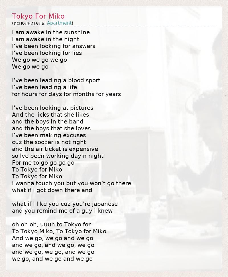 I am awake in the sunshine I am awake in the night I've been looking for answers I've been looking for lies We go we go we go We go we go I've been leading a blood sport I've been leading a life for hours for days for months for years I've been looking at pictures And the licks that she likes and the boys in the band and the boys that she loves I've been making excuses cuz the soozer is not right and the air ticket is expensive so Ive been working day n night For me to go go go go To Tokyo for Miko To Tokyo for Miko I wanna touch you but you won't go there what if I got down there and what if I like you cuz you're japanese and you remind me of a guy I knew oh oh oh, uuuh to Tokyo for To Tokyo Miko, To Tokyo for Miko And we go, we go and we go and we go, and we go, we go and we go, we go, and we go we go, and we go and we go
