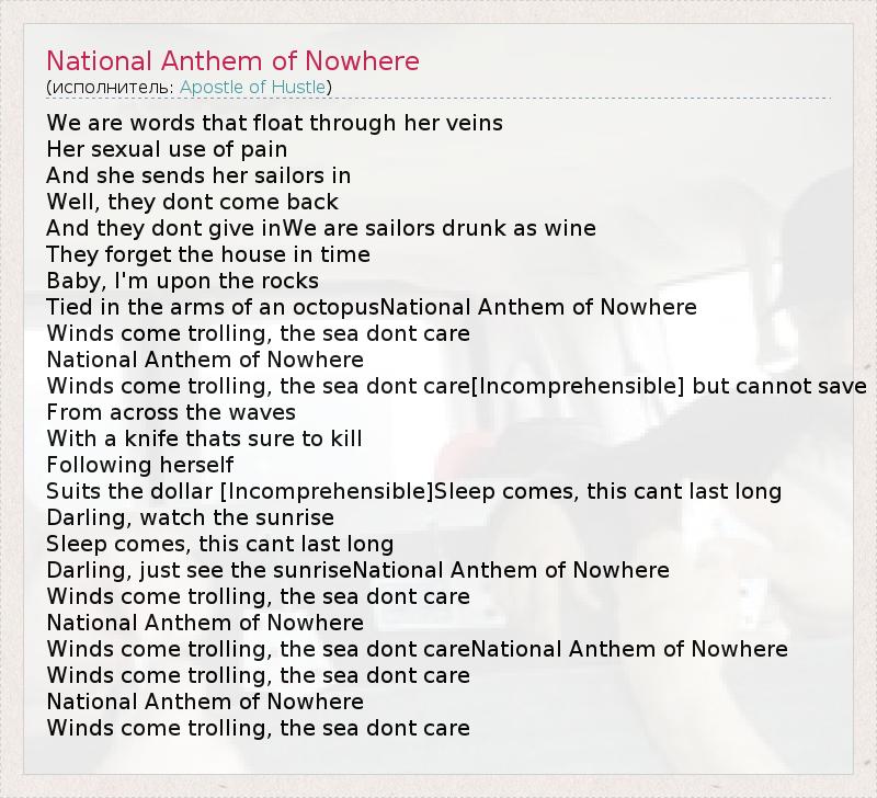 We are words that float through her veins Her sexual use of pain And she sends her sailors in Well, they dont come back And they dont give inWe are sailors drunk as wine They forget the house in time Baby, I'm upon the rocks Tied in the arms of an octopusNational Anthem of Nowhere Winds come trolling, the sea dont care National Anthem of Nowhere Winds come trolling, the sea dont care[Incomprehensible] but cannot save From across the waves With a knife thats sure to kill Following herself Suits the dollar [Incomprehensible]Sleep comes, this cant last long Darling, watch the sunrise Sleep comes, this cant last long Darling, just see the sunriseNational Anthem of Nowhere Winds come trolling, the sea dont care National Anthem of Nowhere Winds come trolling, the sea dont careNational Anthem of Nowhere Winds come trolling, the sea dont care National Anthem of Nowhere Winds come trolling, the sea dont care