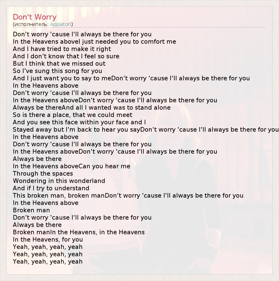 Stayed away but I'm back to hear you sayDon't worry 'cause I'll always be there for you
