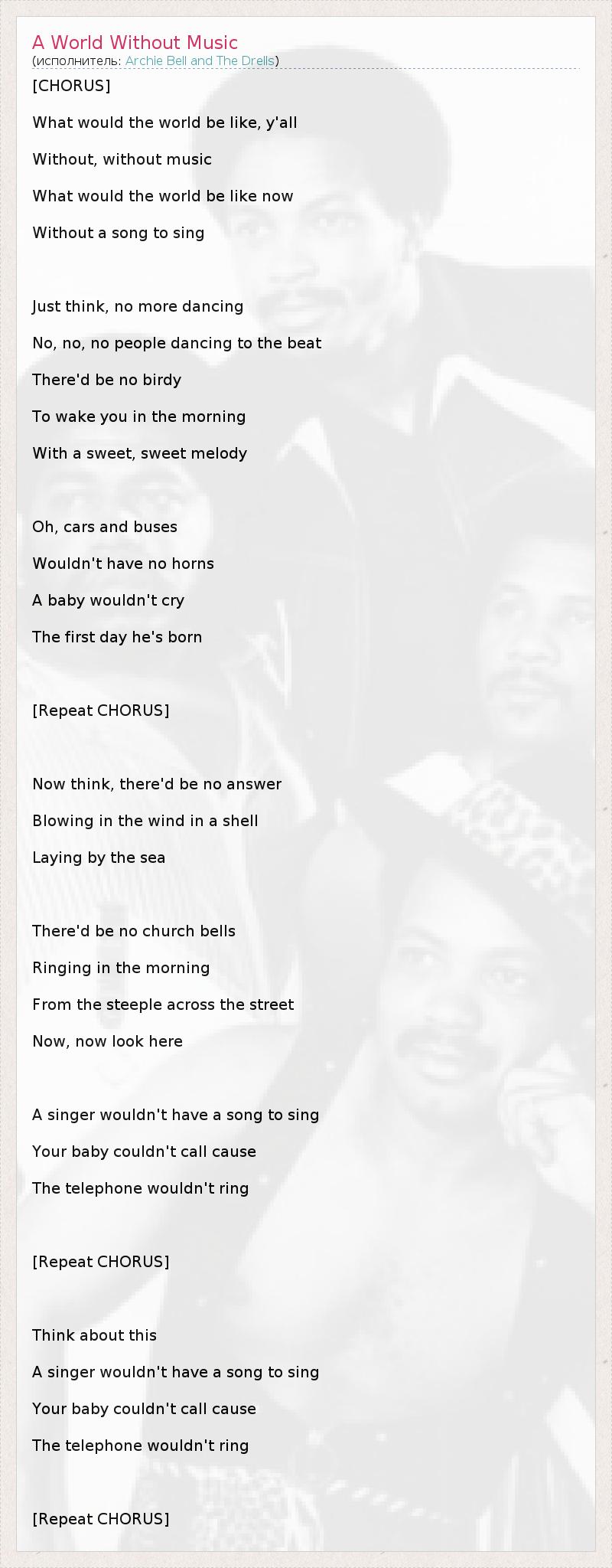 [CHORUS] What would the world be like, y'all Without, without music What would the world be like now Without a song to sing Just think, no more dancing No, no, no people dancing to the beat There'd be no birdy To wake you in the morning With a sweet, sweet melody Oh, cars and buses Wouldn't have no horns A baby wouldn't cry The first day he's born [Repeat CHORUS] Now think, there'd be no answer Blowing in the wind in a shell Laying by the sea There'd be no church bells Ringing in the morning From the steeple across the street Now, now look here A singer wouldn't have a song to sing Your baby couldn't call cause The telephone wouldn't ring [Repeat CHORUS] Think about this A singer wouldn't have a song to sing Your baby couldn't call cause The telephone wouldn't ring [Repeat CHORUS]