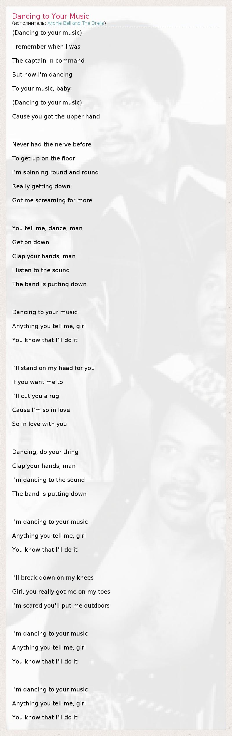 (Dancing to your music) I remember when I was The captain in command But now I'm dancing To your music, baby (Dancing to your music) Cause you got the upper hand Never had the nerve before To get up on the floor I'm spinning round and round Really getting down Got me screaming for more You tell me, dance, man Get on down Clap your hands, man I listen to the sound The band is putting down Dancing to your music Anything you tell me, girl You know that I'll do it I'll stand on my head for you If you want me to I'll cut you a rug Cause I'm so in love So in love with you Dancing, do your thing Clap your hands, man I'm dancing to the sound The band is putting down I'm dancing to your music Anything you tell me, girl You know that I'll do it I'll break down on my knees Girl, you really got me on my toes I'm scared you'll put me outdoors I'm dancing to your music Anything you tell me, girl You know that I'll do it I'm dancing to your music Anything you tell me, girl You know that I'll do it