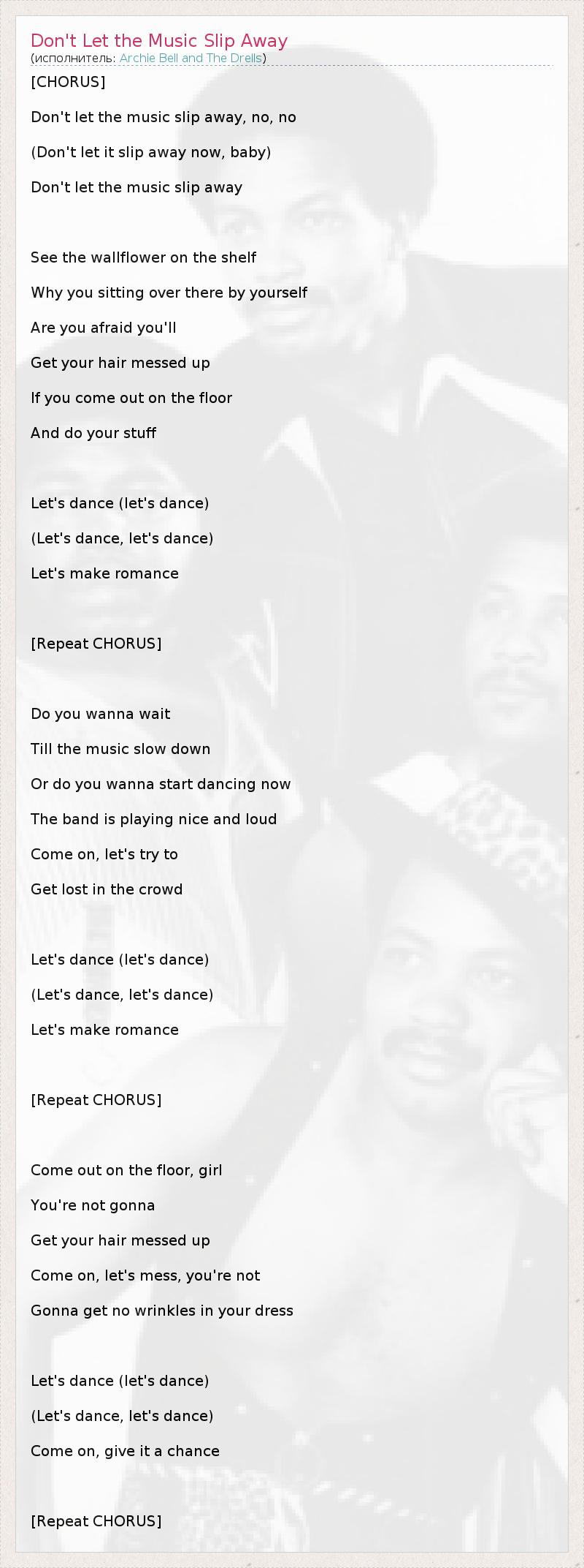 [CHORUS] Don't let the music slip away, no, no (Don't let it slip away now, baby) Don't let the music slip away See the wallflower on the shelf Why you sitting over there by yourself Are you afraid you'll Get your hair messed up If you come out on the floor And do your stuff Let's dance (let's dance) (Let's dance, let's dance) Let's make romance [Repeat CHORUS] Do you wanna wait Till the music slow down Or do you wanna start dancing now The band is playing nice and loud Come on, let's try to Get lost in the crowd Let's dance (let's dance) (Let's dance, let's dance) Let's make romance [Repeat CHORUS] Come out on the floor, girl You're not gonna Get your hair messed up Come on, let's mess, you're not Gonna get no wrinkles in your dress Let's dance (let's dance) (Let's dance, let's dance) Come on, give it a chance [Repeat CHORUS]
