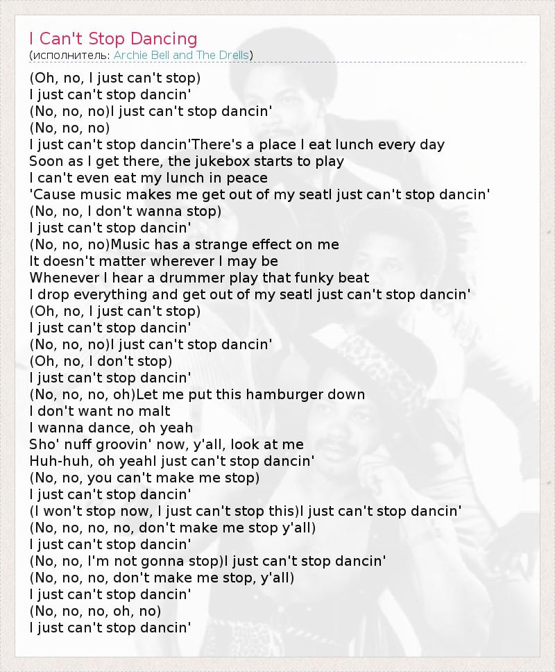 (Oh, no, I just can't stop) I just can't stop dancin' (No, no, no)I just can't stop dancin' (No, no, no) I just can't stop dancin'There's a place I eat lunch every day Soon as I get there, the jukebox starts to play I can't even eat my lunch in peace 'Cause music makes me get out of my seatI just can't stop dancin' (No, no, I don't wanna stop) I just can't stop dancin' (No, no, no)Music has a strange effect on me It doesn't matter wherever I may be Whenever I hear a drummer play that funky beat I drop everything and get out of my seatI just can't stop dancin' (Oh, no, I just can't stop) I just can't stop dancin' (No, no, no)I just can't stop dancin' (Oh, no, I don't stop) I just can't stop dancin' (No, no, no, oh)Let me put this hamburger down I don't want no malt I wanna dance, oh yeah Sho' nuff groovin' now, y'all, look at me Huh-huh, oh yeahI just can't stop dancin' (No, no, you can't make me stop) I just can't stop dancin' (I won't stop now, I just can't stop this)I just can't stop dancin' (No, no, no, no, don't make me stop y'all) I just can't stop dancin' (No, no, I'm not gonna stop)I just can't stop dancin' (No, no, no, don't make me stop, y'all) I just can't stop dancin' (No, no, no, oh, no) I just can't stop dancin'