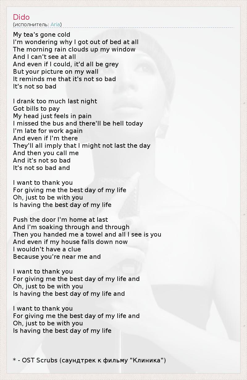 My tea's gone cold I'm wondering why I got out of bed at all The morning rain clouds up my window And I can't see at all And even if I could, it'd all be grey But your picture on my wall It reminds me that it's not so bad It's not so bad I drank too much last night Got bills to pay My head just feels in pain I missed the bus and there'll be hell today I'm late for work again And even if I'm there They'll all imply that I might not last the day And then you call me And it's not so bad It's not so bad and I want to thank you For giving me the best day of my life Oh, just to be with you Is having the best day of my life Push the door I'm home at last And I'm soaking through and through Then you handed me a towel and all I see is you And even if my house falls down now I wouldn't have a clue Because you're near me and I want to thank you For giving me the best day of my life and Oh, just to be with you Is having the best day of my life and I want to thank you For giving me the best day of my life and Oh, just to be with you Is having the best day of my life * - OST Scrubs (саундтрек к фильму "Клиника")