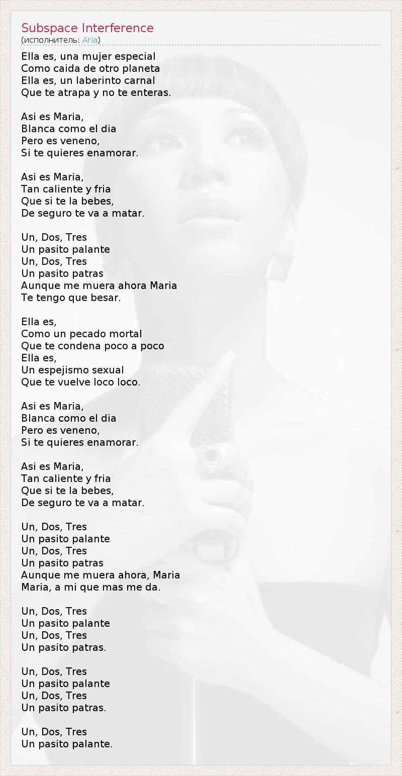 Она — особая женщина, Будто упавшая с другой планеты, Она — лабиринт чувств, Что поймал тебя без спросу. Такова Мария, Светлая словно день, Но яд, Если хочешь влюбиться в нее. Такова Мария, Так горяча и холодна, Что если ее пьешь, Уверен, это убьет тебя. Раз, два, три, Шажок вперед, Раз, два, три, Шажок назад. Мария, хотя сейчас умираю, Должен целовать тебя. Она Как смертный грех, Что осуждает тебя все меньше, Она — Сексуальный мираж, Что превращает тебя в безумца. Такова Мария, Светлая словно день, Но яд, Если хочешь в нее влюбиться. Такова Мария, Так горяча и холодна, Что если ее пьешь, Уверен, это убьет тебя. Раз, два, три, Шажок вперед, Раз, два, три, Шажок назад, Мария, хотя сейчас умираю, Должен целовать тебя. Раз, два, три, Шажок вперед, Раз, два, три, Шажок назад. Раз, два, три, Шажок вперед, Раз, два, три, Шажок назад. Раз, два, три, Шажок вперед.