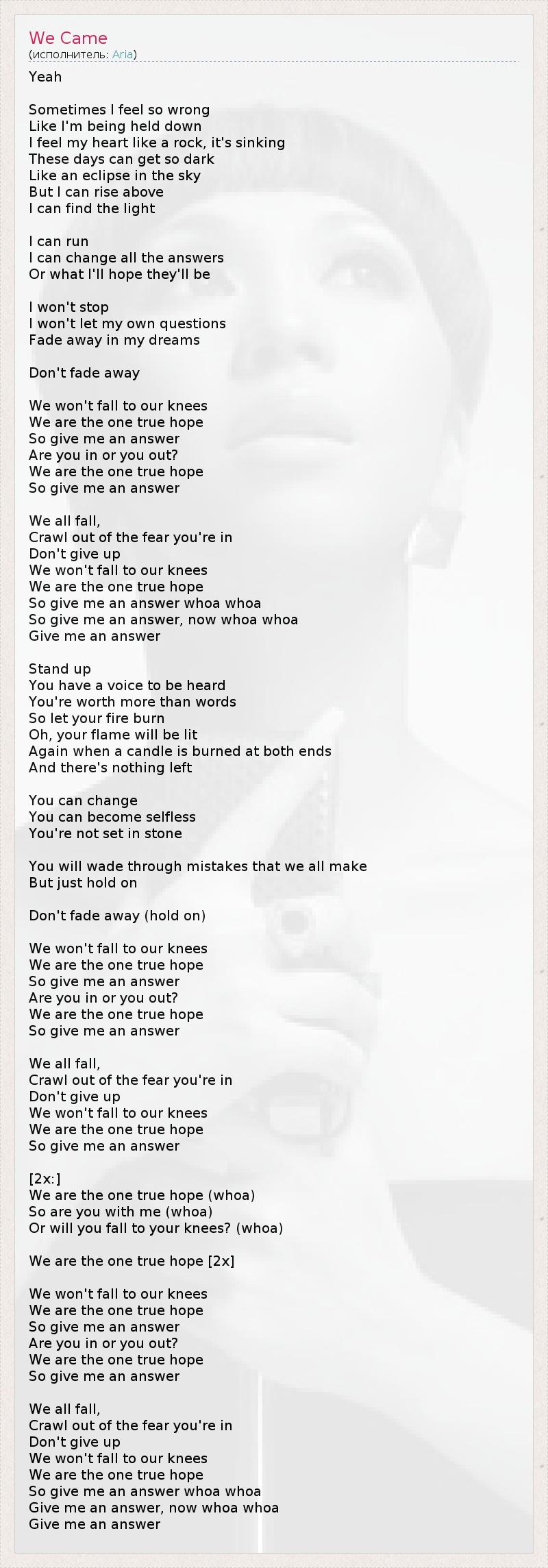 Yeah Sometimes I feel so wrong Like I'm being held down I feel my heart like a rock, it's sinking These days can get so dark Like an eclipse in the sky But I can rise above I can find the light I can run I can change all the answers Or what I'll hope they'll be I won't stop I won't let my own questions Fade away in my dreams Don't fade away We won't fall to our knees We are the one true hope So give me an answer Are you in or you out? We are the one true hope So give me an answer We all fall, Crawl out of the fear you're in Don't give up We won't fall to our knees We are the one true hope So give me an answer whoa whoa So give me an answer, now whoa whoa Give me an answer Stand up You have a voice to be heard You're worth more than words So let your fire burn Oh, your flame will be lit Again when a candle is burned at both ends And there's nothing left You can change You can become selfless You're not set in stone You will wade through mistakes that we all make But just hold on Don't fade away (hold on) We won't fall to our knees We are the one true hope So give me an answer Are you in or you out? We are the one true hope So give me an answer We all fall, Сrawl out of the fear you're in Don't give up We won't fall to our knees We are the one true hope So give me an answer [2x:] We are the one true hope (whoa) So are you with me (whoa) Or will you fall to your knees? (whoa) We are the one true hope [2x] We won't fall to our knees We are the one true hope So give me an answer Are you in or you out? We are the one true hope So give me an answer We all fall, Crawl out of the fear you're in Don't give up We won't fall to our knees We are the one true hope So give me an answer whoa whoa Give me an answer, now whoa whoa Give me an answer