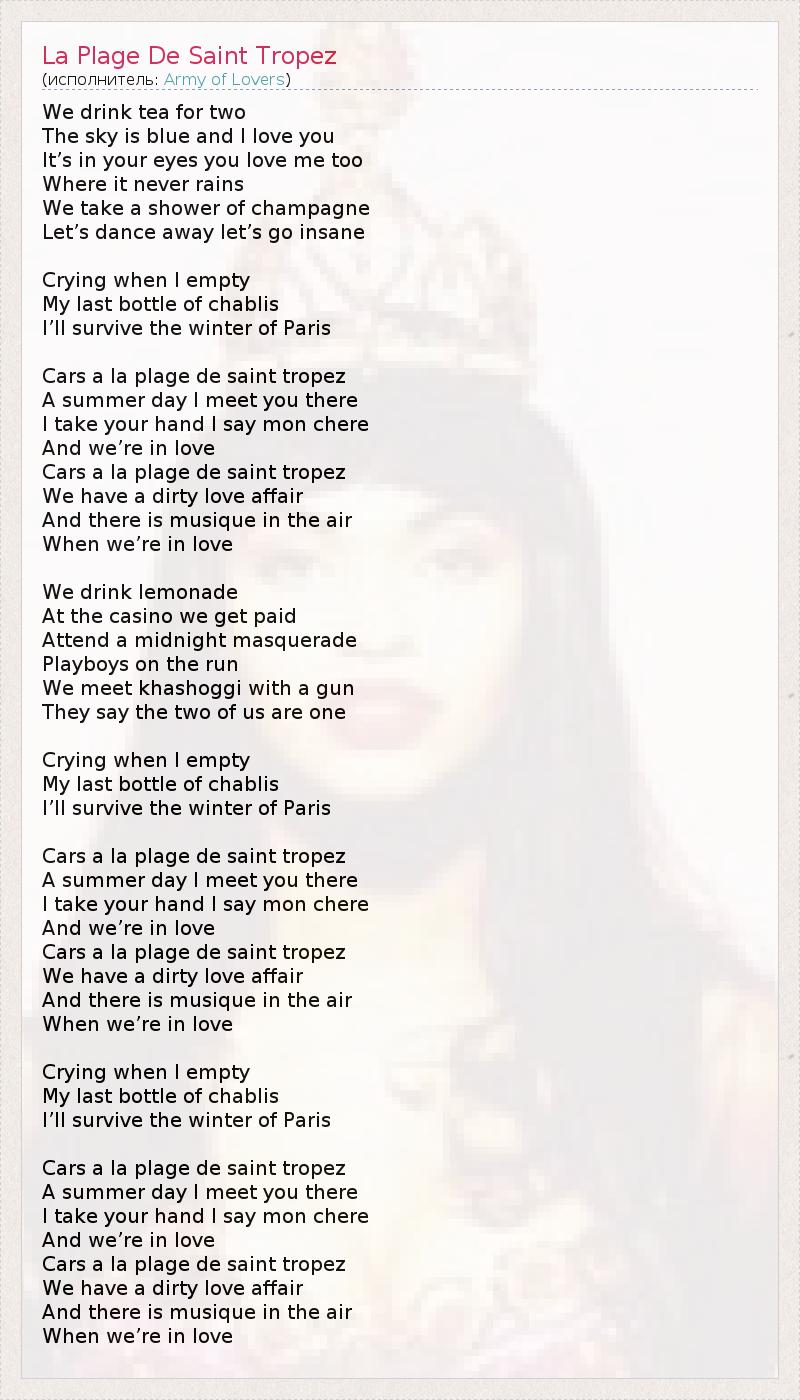 Мы вдовоём пьём чай, Голубое небо, и я люблю тебя... Оно в твоих глазах, ты любишь меня тоже... Где никогда не бывает дождей Мы попадаем под душ из шампанского. Давай пустимся в танец, давай, раскрепостись. Обидно, когда я опустошаю Последнюю бутылку шабли, Я переживу зиму Парижа. Машины на пляже Сент-Тропе, Летним днём я встретил тебя там, Я взял тебя за руку, я сказал "моя дорогая", И мы влюбились. Машины на пляже Сент-Тропе, Мы завели там грязную любовную интригу, И музыка витала в воздухе, Когда мы влюбились. Мы пьём лимонад, Проигрываемся в казино, Присоединяемся к полуночному маскараду. Плейбои бросились бежать, Когда мы встретили бандитов с оружием Они сказали: двое из нас или один... Обидно, когда я опустошаю Последнюю бутылку шабли, Я переживу зиму Парижа. Машины на пляже Сент-Тропе, Летним днём я встретил тебя там, Я взял тебя за руку, я сказал "моя дорогая", И мы влюбились. Машины на пляже Сент-Тропе, Мы завели там грязную любовную интригу, И музыка витала в воздухе, Когда мы влюбились. Обидно, когда я опустошаю Последнюю бутылку шабли, Я переживу зиму Парижа. Машины на пляже Сент-Тропе, Летним днём я встретил тебя там, Я взял тебя за руку, я сказал "моя дорогая", И мы влюбились. Машины на пляже Сент-Тропе, Мы завели там грязную любовную интригу, И музыка витала в воздухе, Когда мы влюбились.