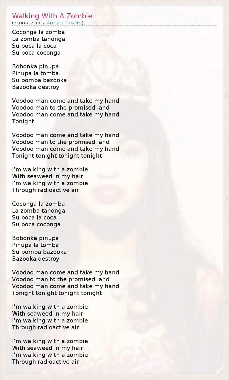 Coconga la zomba La zomba tahonga Su boca la coca Su boca coconga Bobonka pinupa Pinupa la tomba Su bomba bazooka Bazooka destroy Voodoo man come and take my hand Voodoo man to the promised land Voodoo man come and take my hand Tonight Voodoo man come and take my hand Voodoo man to the promised land Voodoo man come and take my hand Tonight tonight tonight tonight I'm walking with a zombie With seaweed in my hair I'm walking with a zombie Through radioactive air Coconga la zomba La zomba tahonga Su boca la coca Su boca coconga Bobonka pinupa Pinupa la tomba Su bomba bazooka Bazooka destroy Voodoo man come and take my hand Voodoo man to the promised land Voodoo man come and take my hand Tonight tonight tonight tonight I'm walking with a zombie With seaweed in my hair I'm walking with a zombie Through radioactive air I'm walking with a zombie With seaweed in my hair I'm walking with a zombie Through radioactive air