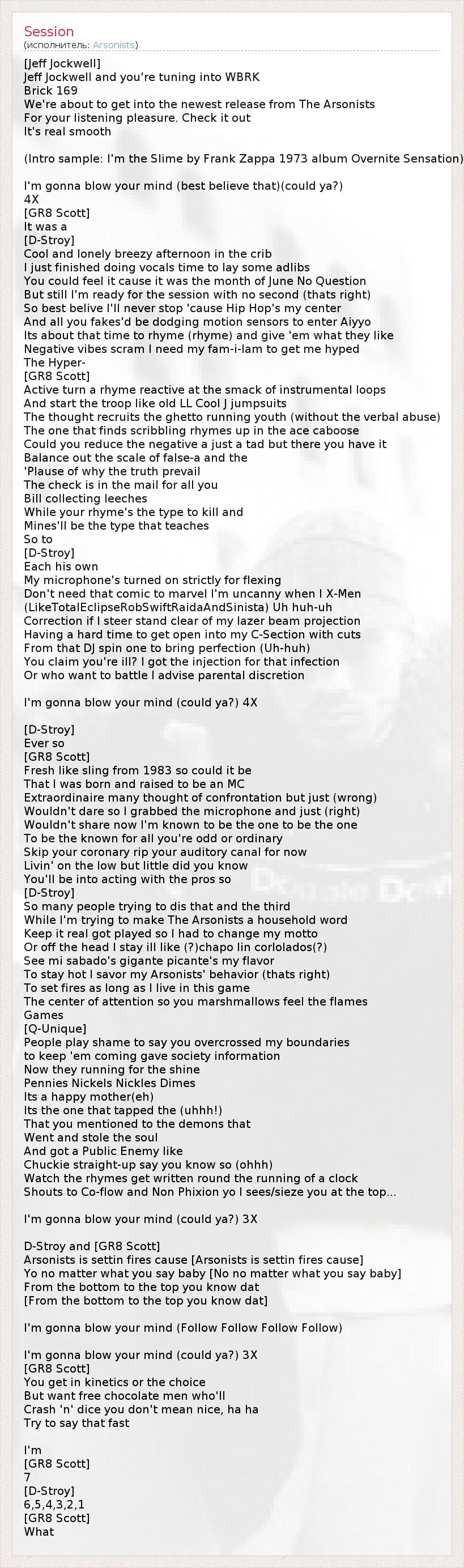 [Jeff Jockwell] Jeff Jockwell and you're tuning into WBRK Brick 169 We're about to get into the newest release from The Arsonists For your listening pleasure. Check it out It's real smooth (Intro sample: I'm the Slime by Frank Zappa 1973 album Overnite Sensation) I'm gonna blow your mind (best believe that)(could ya?) 4X [GR8 Scott] It was a [D-Stroy] Cool and lonely breezy afternoon in the crib I just finished doing vocals time to lay some adlibs You could feel it cause it was the month of June No Question But still I'm ready for the session with no second (thats right) So best belive I'll never stop 'cause Hip Hop's my center And all you fakes'd be dodging motion sensors to enter Aiyyo Its about that time to rhyme (rhyme) and give 'em what they like Negative vibes scram I need my fam-i-lam to get me hyped The Hyper- [GR8 Scott] Active turn a rhyme reactive at the smack of instrumental loops And start the troop like old LL Cool J jumpsuits The thought recruits the ghetto running youth (without the verbal abuse) The one that finds scribbling rhymes up in the ace caboose Could you reduce the negative a just a tad but there you have it Balance out the scale of false-a and the 'Plause of why the truth prevail The check is in the mail for all you Bill collecting leeches While your rhyme's the type to kill and Mines'll be the type that teaches So to [D-Stroy] Each his own My microphone's turned on strictly for flexing Don't need that comic to marvel I'm uncanny when I X-Men (LikeTotalEclipseRobSwiftRaidaAndSinista) Uh huh-uh Correction if I steer stand clear of my lazer beam projection Having a hard time to get open into my C-Section with cuts From that DJ spin one to bring perfection (Uh-huh) You claim you're ill? I got the injection for that infection Or who want to battle I advise parental discretion I'm gonna blow your mind (could ya?) 4X [D-Stroy] Ever so [GR8 Scott] Fresh like sling from 1983 so could it be That I was born and raised to be an MC Extraordinaire many thought of confrontation but just (wrong) Wouldn't dare so I grabbed the microphone and just (right) Wouldn't share now I'm known to be the one to be the one To be the known for all you're odd or ordinary Skip your coronary rip your auditory canal for now Livin' on the low but little did you know You'll be into acting with the pros so [D-Stroy] So many people trying to dis that and the third While I'm trying to make The Arsonists a household word Keep it real got played so I had to change my motto Or off the head I stay ill like (?)chapo lin corlolados(?) See mi sabado's gigante picante's my flavor To stay hot I savor my Arsonists' behavior (thats right) To set fires as long as I live in this game The center of attention so you marshmallows feel the flames Games [Q-Unique] People play shame to say you overcrossed my boundaries to keep 'em coming gave society information Now they running for the shine Pennies Nickels Nickles Dimes Its a happy mother(eh) Its the one that tapped the (uhhh!) That you mentioned to the demons that Went and stole the soul And got a Public Enemy like Chuckie straight-up say you know so (ohhh) Watch the rhymes get written round the running of a clock Shouts to Co-flow and Non Phixion yo I sees/sieze you at the top... I'm gonna blow your mind (could ya?) 3X D-Stroy and [GR8 Scott] Arsonists is settin fires cause [Arsonists is settin fires cause] Yo no matter what you say baby [No no matter what you say baby] From the bottom to the top you know dat [From the bottom to the top you know dat] I'm gonna blow your mind (Follow Follow Follow Follow) I'm gonna blow your mind (could ya?) 3X [GR8 Scott] You get in kinetics or the choice But want free chocolate men who'll Crash 'n' dice you don't mean nice, ha ha Try to say that fast I'm [GR8 Scott] 7 [D-Stroy] 6,5,4,3,2,1 [GR8 Scott] What