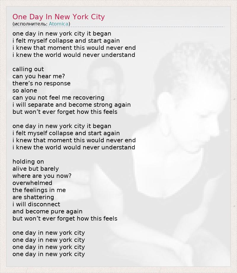 one day in new york city it began i felt myself collapse and start again i knew that moment this would never end i knew the world would never understand calling out can you hear me? there’s no response so alone can you not feel me recovering i will separate and become strong again but won’t ever forget how this feels one day in new york city it began i felt myself collapse and start again i knew that moment this would never end i knew the world would never understand holding on alive but barely where are you now? overwhelmed the feelings in me are shattering i will disconnect and become pure again but won’t ever forget how this feels one day in new york city one day in new york city one day in new york city one day in new york city