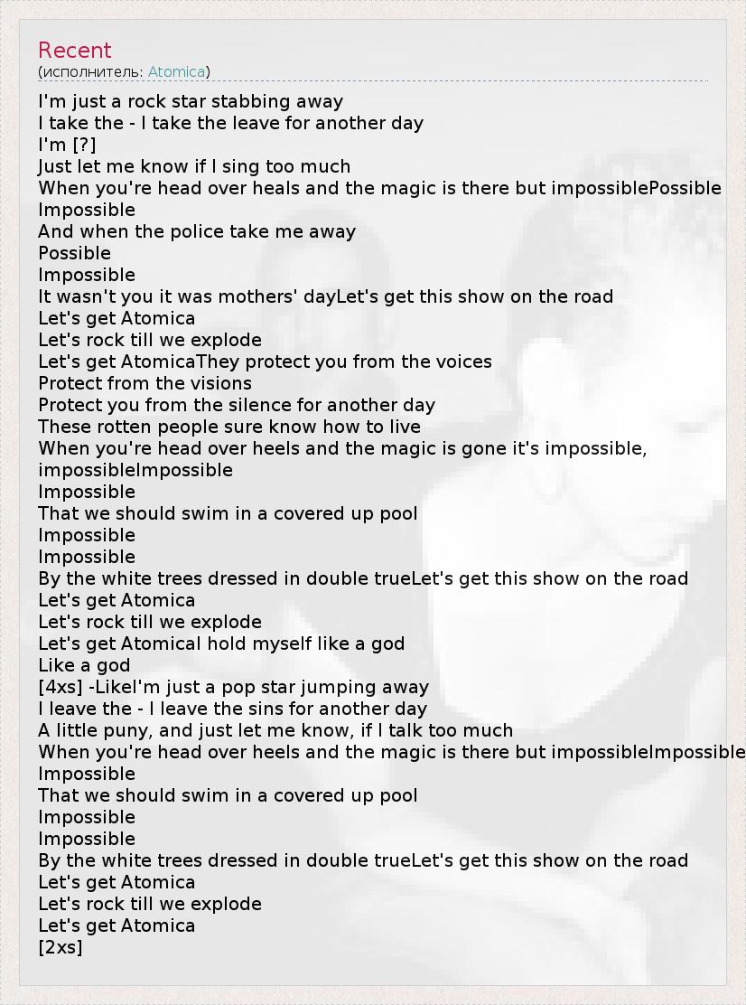 I'm just a rock star stabbing away I take the - I take the leave for another day I'm [?] Just let me know if I sing too much When you're head over heals and the magic is there but impossiblePossible Impossible And when the police take me away Possible Impossible It wasn't you it was mothers' dayLet's get this show on the road Let's get Atomica Let's rock till we explode Let's get AtomicaThey protect you from the voices Protect from the visions Protect you from the silence for another day These rotten people sure know how to live When you're head over heels and the magic is gone it's impossible, impossibleImpossible Impossible That we should swim in a covered up pool Impossible Impossible By the white trees dressed in double trueLet's get this show on the road Let's get Atomica Let's rock till we explode Let's get AtomicaI hold myself like a god Like a god [4xs] -LikeI'm just a pop star jumping away I leave the - I leave the sins for another day A little puny, and just let me know, if I talk too much When you're head over heels and the magic is there but impossibleImpossible Impossible That we should swim in a covered up pool Impossible Impossible By the white trees dressed in double trueLet's get this show on the road Let's get Atomica Let's rock till we explode Let's get Atomica [2xs]