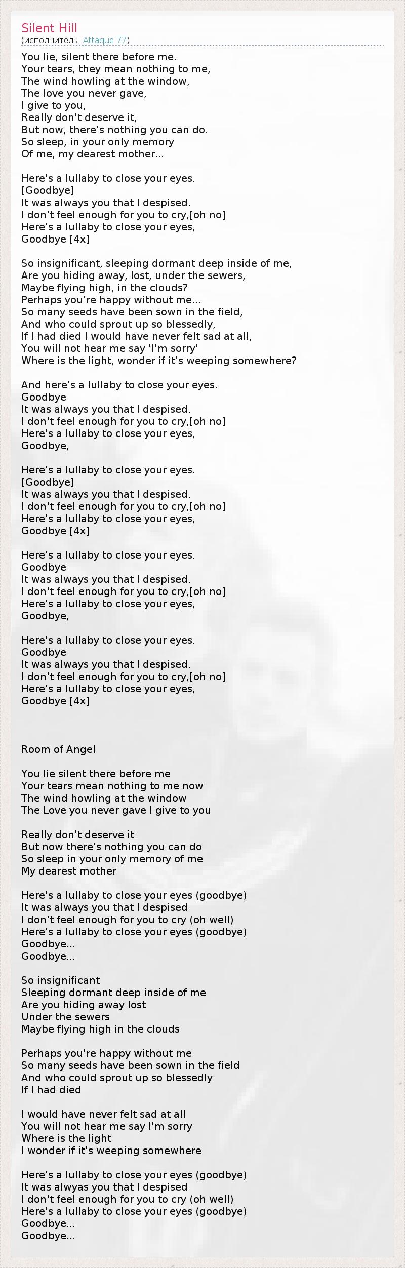Ты беззвучно лежишь напротив, Твои слёзы, они ничего не значат для меня, Возле окна завывает ветер, Любовь, которой ты никогда не дарила, Я дарю её тебе, Незаслуженно, на самом деле, Но сейчас, ты ничего не можешь сделать. Поэтому спи в своем единственном воспоминании Обо мне, моя любимая мать... Я пою колыбельную, чтобы ты закрыла глаза, Прощай! Ты была той, кого я всегда презирала, Мне никогда не будет достаточно твоих слёз, о нет, Я пою колыбельную, чтобы ты закрыла глаза... Прощай [4x] Такая незначительная, спящая глубоко во мне, Неужели ты прячешься, потерянная меж коллекторов, А, возможно, паря высоко в облаках? Наверное, ты счастлива без меня... Так много семян было посеяно в поле, Что могло вырасти из них благословенно? Моя смерть вовсе не огорчила бы меня, Ты никогда не услышишь, как я говорю "Прости" Где же свет, интересно, плачет ли он где-нибудь? Я пою колыбельную, чтобы ты закрыла глаза, Прощай! Ты была той, кого я всегда презирала, Мне никогда не будет достаточно твоих слёз, о нет, Я пою колыбельную, чтобы ты закрыла глаза... Прощай!... Я пою колыбельную, чтобы ты закрыла глаза, Прощай! Ты была той, кого я всегда презирала, Мне никогда не будет достаточно твоих слёз, о нет, Я пою колыбельную, чтобы ты закрыла глаза... Прощай [4x] Я пою колыбельную, чтобы ты закрыла глаза, Прощай! Ты была той, кого я всегда презирала, Мне никогда не будет достаточно твоих слёз, о нет, Я пою колыбельную, чтобы ты закрыла глаза... Прощай!... Я пою колыбельную, чтобы ты закрыла глаза, Прощай! Ты была той, кого я всегда презирала, Мне никогда не будет достаточно твоих слёз, о нет, Я пою колыбельную, чтобы ты закрыла глаза... Прощай [4x] Комната ангела (перевод Евгений Гурылёв из Москвы) Твоя ложь, как эта тишина, Твои слёзы ничто не значат для меня... Ветер воющий в окне, Любовь, которую не дашь, я сама возьму.. Хоть и не заслуживаю, Но теперь ничего ты не сделаешь. Так что сон, застывший в твоей голове, Дорогая мама, будет только обо мне... Я пою тебе [колыбельную], закрой глаза (прощай) Ненавидишь ты теперь меня... И не упадёт с лица слеза (ну что ж) Я пою тебе - закрой глаза (прощай) Прощай... Прощай... Это так ничтожно.... Где-то внутри я впала в глубокую дрёму... Ты скрываешься прочь В канализациях Или летишь высоко в небесах? Возможно, ты счастлива без меня, Так много семян посеяно на поле.... И кто собрал бы те священные ростки, Если бы я умер? По-моему, я никогда не была такой печальной, Ты не слышишь, как я прошу прощения... Где этот свет? Может, он где-то плачет... Я пою тебе [колыбельную], закрой глаза (прощай) Ненавидишь ты теперь меня... И не упадёт с лица слеза (ну что ж) Я пою тебе - закрой глаза (прощай) Прощай... Прощай...