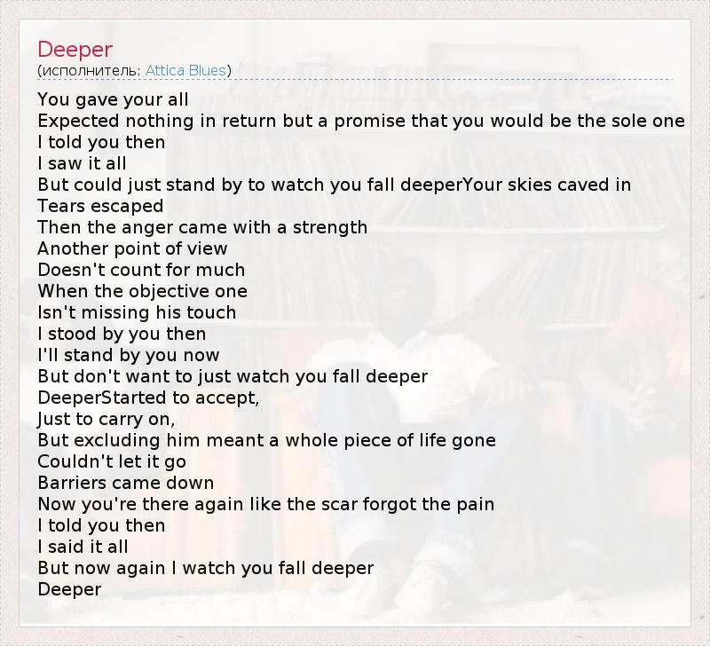 You gave your all Expected nothing in return but a promise that you would be the sole one I told you then I saw it all But could just stand by to watch you fall deeperYour skies caved in Tears escaped Then the anger came with a strength Another point of view Doesn't count for much When the objective one Isn't missing his touch I stood by you then I'll stand by you now But don't want to just watch you fall deeper DeeperStarted to accept, Just to carry on, But excluding him meant a whole piece of life gone Couldn't let it go Barriers came down Now you're there again like the scar forgot the pain I told you then I said it all But now again I watch you fall deeper Deeper