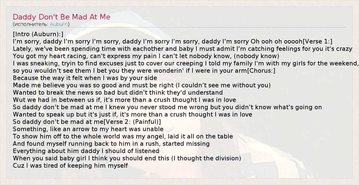 [Intro (Auburn):] I'm sorry, daddy I'm sorry I'm sorry, daddy I'm sorry I'm sorry, daddy I'm sorry Oh ooh oh ooooh[Verse 1:] Lately, we've been spending time with eachother and baby I must admit I'm catching feelings for you it's crazy You got my heart racing, can't express my pain I can't let nobody know, (nobody know) I was sneaking, tryin to find excuses just to cover our creeping I told my family I'm with my girls for the weekend, so you wouldn't see them I bet you they were wonderin' if I were in your arm[Chorus:] Because the way it felt when I was by your side Made me believe you was so good and must be right (I couldn't see me without you) Wanted to break the news so bad but didn't think they'd understand Wut we had in between us if, it's more than a crush thought I was in love So daddy don't be mad at me I knew you never stood me wrong but you didn't know what's going on Wanted to speak up but it's just if, it's more than a crush thought I was in love So daddy don't be mad at me[Verse 2: (Painful)] Something, like an arrow to my heart was unable To show him off to the whole world was my angel, laid it all on the table And found myself running back to him in a rush, started missing Everything about him daddy I should of listened When you said baby girl I think you should end this (I thought the division) Cuz I was tired of keeping him myself