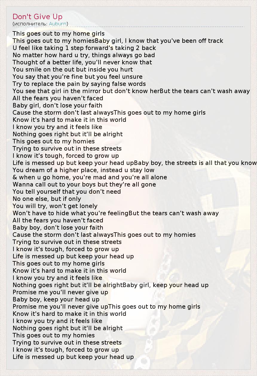 This goes out to my home girls This goes out to my homiesBaby girl, I know that you've been off track U feel like taking 1 step forward's taking 2 back No matter how hard u try, things always go bad Thought of a better life, you'll never know that You smile on the out but inside you hurt You say that you're fine but you feel unsure Try to replace the pain by saying false words You see that girl in the mirror but don't know herBut the tears can't wash away All the fears you haven't faced Baby girl, don't lose your faith Cause the storm don't last alwaysThis goes out to my home girls Know it's hard to make it in this world I know you try and it feels like Nothing goes right but it'll be alright This goes out to my homies Trying to survive out in these streets I know it's tough, forced to grow up Life is messed up but keep your head upBaby boy, the streets is all that you know You dream of a higher place, instead u stay low & when u go home, you're mad and you're all alone Wanna call out to your boys but they're all gone You tell yourself that you don't need No one else, but if only You will try, won't get lonely Won't have to hide what you're feelingBut the tears can't wash away All the fears you haven't faced Baby boy, don't lose your faith Cause the storm don't last alwaysThis goes out to my homies Trying to survive out in these streets I know it's tough, forced to grow up Life is messed up but keep your head up This goes out to my home girls Know it's hard to make it in this world I know you try and it feels like Nothing goes right but it'll be alrightBaby girl, keep your head up Promise me you'll never give up Baby boy, keep your head up Promise me you'll never give upThis goes out to my home girls Know it's hard to make it in this world I know you try and it feels like Nothing goes right but it'll be alright This goes out to my homies Trying to survive out in these streets I know it's tough, forced to grow up Life is messed up but keep your head up