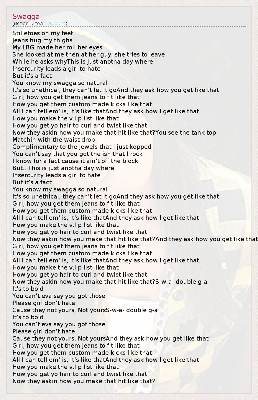 Stilletoes on my feet Jeans hug my thighs My LRG made her roll her eyes She looked at me then at her guy, she tries to leave While he asks whyThis is just anotha day where Insercurity leads a girl to hate But it's a fact You know my swagga so natural It's so unethical, they can't let it goAnd they ask how you get like that Girl, how you get them jeans to fit like that How you get them custom made kicks like that All I can tell em' is, It's like thatAnd they ask how I get like that How you make the v.I.p list like that How you get yo hair to curl and twist like that Now they askin how you make that hit like that?You see the tank top Matchin with the waist drop Complimentary to the jewels that I just kopped You can't say that you got the ish that I rock I know for a fact cause it ain't off the block But...This is just anotha day where Insercurity leads a girl to hate But it's a fact You know my swagga so natural It's so unethical, they can't let it goAnd they ask how you get like that Girl, how you get them jeans to fit like that How you get them custom made kicks like that All I can tell em' is, It's like thatAnd they ask how I get like that How you make the v.I.p list like that How you get yo hair to curl and twist like that Now they askin how you make that hit like that?And they ask how you get like that Girl, how you get them jeans to fit like that How you get them custom made kicks like that All I can tell em' is, It's like thatAnd they ask how I get like that How you make the v.I.p list like that How you get yo hair to curl and twist like that Now they askin how you make that hit like that?S-w-a- double g-a It's to bold You can't eva say you got those Please girl don't hate Cause they not yours, Not yoursS-w-a- double g-a It's to bold You can't eva say you got those Please girl don't hate Cause they not yours, Not yoursAnd they ask how you get like that Girl, how you get them jeans to fit like that How you get them custom made kicks like that All I can tell em' is, It's like thatAnd they ask how I get like that How you make the v.I.p list like that How you get yo hair to curl and twist like that Now they askin how you make that hit like that?