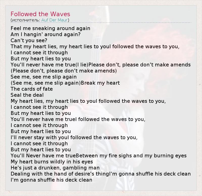Feel me sneaking around again Am I hangin' around again? Can't you see? That my heart lies, my heart lies to youI followed the waves to you, I cannot see it through But my heart lies to you You'll never have me true(I lie)Please don't, please don't make amends (Please don't, please don't make amends) See me, see me slip again (See me, see me slip again)Break my heart The cards of fate Seal the deal My heart lies, my heart lies to youI followed the waves to you, I cannot see it through But my heart lies to you You'll never have me trueI followed the waves to you, I cannot see it through But my heart lies to you I'll never stay with youI followed the waves to you, I cannot see it through But my heart lies to you You'll Never have me trueBetween my fire sighs and my burning eyes My heart burns wildly in his eyes He's just a drunken, gambling man Dealing with the hand of desire's thingI'm gonna shuffle his deck clean I'm gonna shuffle his deck clean