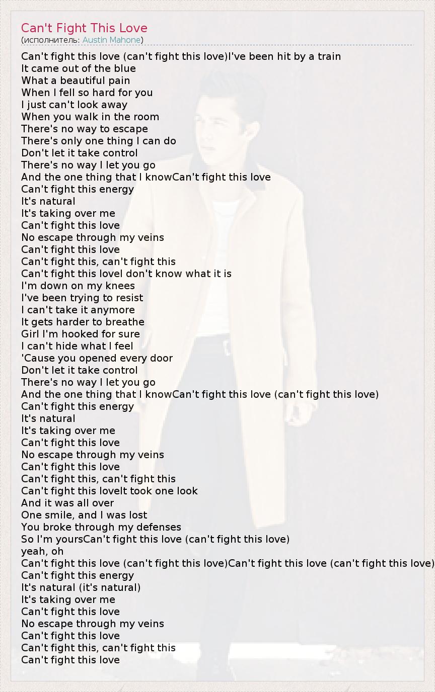 Can't fight this love (can't fight this love)I've been hit by a train It came out of the blue What a beautiful pain When I fell so hard for you I just can't look away When you walk in the room There's no way to escape There's only one thing I can do Don't let it take control There's no way I let you go And the one thing that I knowCan't fight this love Can't fight this energy It's natural It's taking over me Can't fight this love No escape through my veins Can't fight this love Can't fight this, can't fight this Can't fight this loveI don't know what it is I'm down on my knees I've been trying to resist I can't take it anymore It gets harder to breathe Girl I'm hooked for sure I can't hide what I feel 'Cause you opened every door Don't let it take control There's no way I let you go And the one thing that I knowCan't fight this love (can't fight this love) Can't fight this energy It's natural It's taking over me Can't fight this love No escape through my veins Can't fight this love Can't fight this, can't fight this Can't fight this loveIt took one look And it was all over One smile, and I was lost You broke through my defenses So I'm yoursCan't fight this love (can't fight this love) yeah, oh Can't fight this love (can't fight this love)Can't fight this love (can't fight this love) Can't fight this energy It's natural (it's natural) It's taking over me Can't fight this love No escape through my veins Can't fight this love Can't fight this, can't fight this Can't fight this love