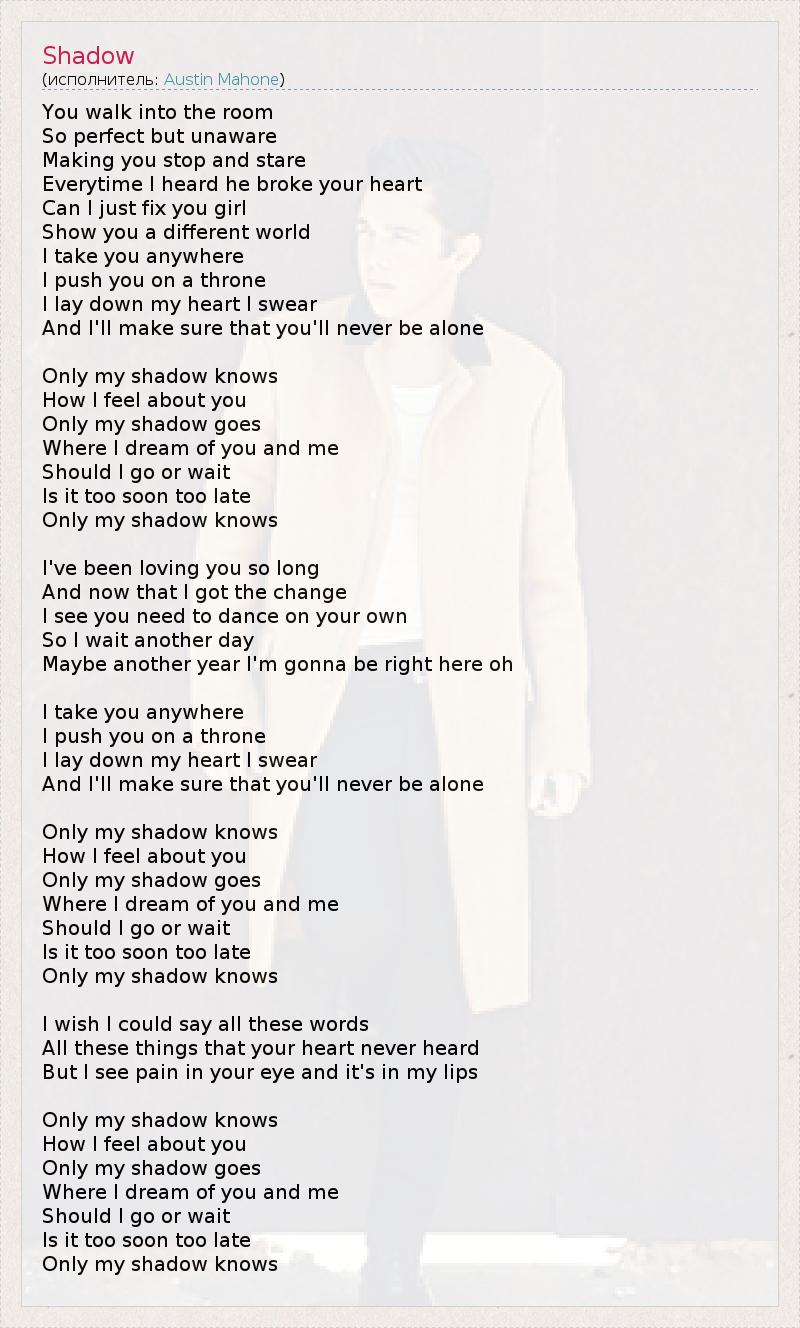Ты входишь в комнату, Идеальная, но не знающая, Останавливаешься и смотришь в одну точку. Каждый раз, как я слышу, что он разбивает твоё сердце, Могу ли я склеить его? Я покажу тебе другой мир, Приведу тебя, куда захочешь, Усажу на трон И положу своё сердце к твоим ногам, обещаю. И я гарантирую: ты никогда не будешь одинока. Только моя тень знает о Чувствах, что я испытываю к тебе. Только моя тень оказывается В местах, где я мечтаю быть с тобой. Должен ли я уйти или остаться? Уже слишком поздно или слишком рано? Только моя тень знает. Я так долго любил тебя. Теперь, когда пришли перемены, Я вижу, что ты должна танцевать одна, Так что я подожду. Может быть, в следующем году я буду рядом, о... Я приведу тебя куда захочешь, Усажу на трон И положу своё сердце к твоим ногам, обещаю. И я гарантирую: ты никогда не будешь одинока. Только моя тень знает о Чувствах, что я испытываю к тебе. Только моя тень оказывается В местах, где я мечтаю быть с тобой. Должен ли я уйти или остаться? Уже слишком поздно или слишком рано? Только моя тень знает. Как бы я хотел произнести эти слова, Рассказать тебе обо всём, что твоё сердце никогда не узнает, Но я вижу боль в твоих глазах, и она на моих губах. Только моя тень знает о Чувствах, что я испытываю к тебе. Только моя тень оказывается В местах, где я мечтаю быть с тобой. Должен ли я уйти или остаться? Уже слишком поздно или слишком рано? Только моя тень знает.