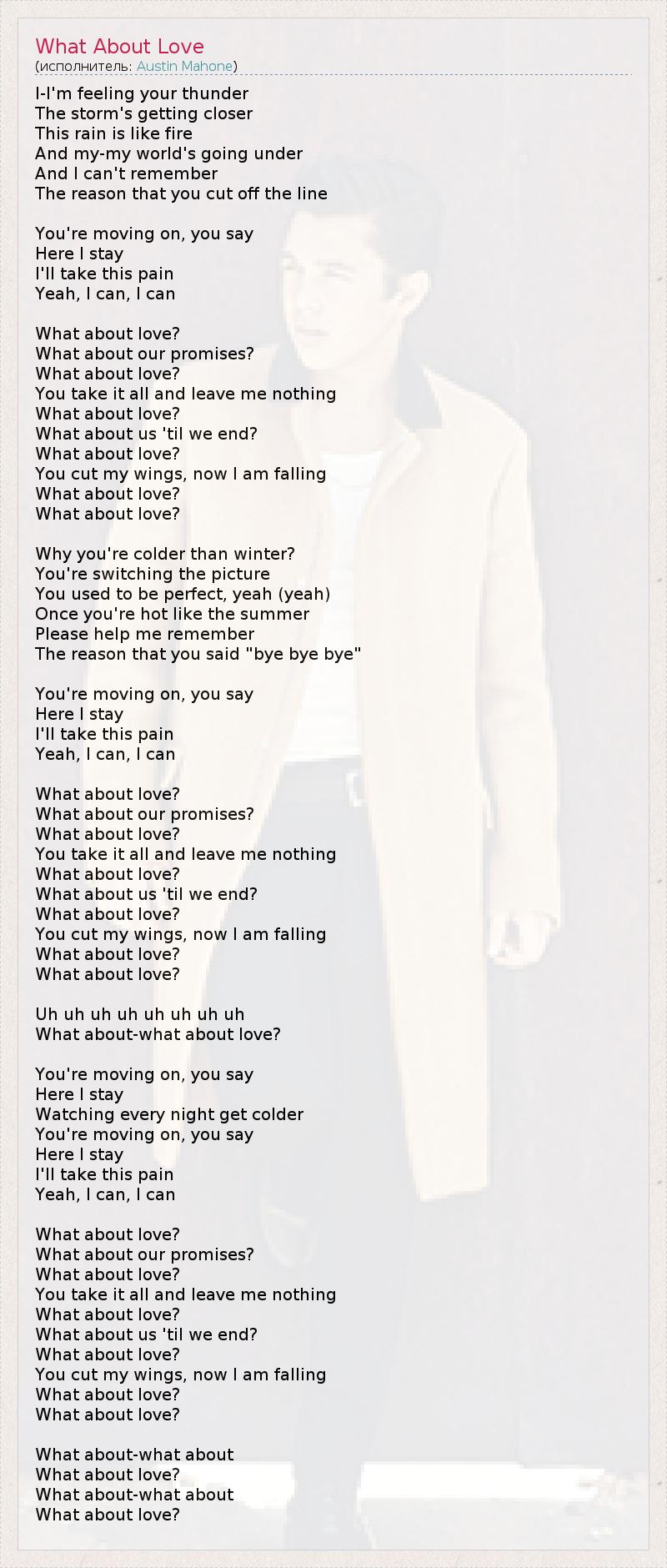 I-I'm feeling your thunder The storm's getting closer This rain is like fire And my-my world's going under And I can't remember The reason that you cut off the line You're moving on, you say Here I stay I'll take this pain Yeah, I can, I can What about love? What about our promises? What about love? You take it all and leave me nothing What about love? What about us 'til we end? What about love? You cut my wings, now I am falling What about love? What about love? Why you're colder than winter? You're switching the picture You used to be perfect, yeah (yeah) Once you're hot like the summer Please help me remember The reason that you said "bye bye bye" You're moving on, you say Here I stay I'll take this pain Yeah, I can, I can What about love? What about our promises? What about love? You take it all and leave me nothing What about love? What about us 'til we end? What about love? You cut my wings, now I am falling What about love? What about love? Uh uh uh uh uh uh uh uh What about-what about love? You're moving on, you say Here I stay Watching every night get colder You're moving on, you say Here I stay I'll take this pain Yeah, I can, I can What about love? What about our promises? What about love? You take it all and leave me nothing What about love? What about us 'til we end? What about love? You cut my wings, now I am falling What about love? What about love? What about-what about What about love? What about-what about What about love?