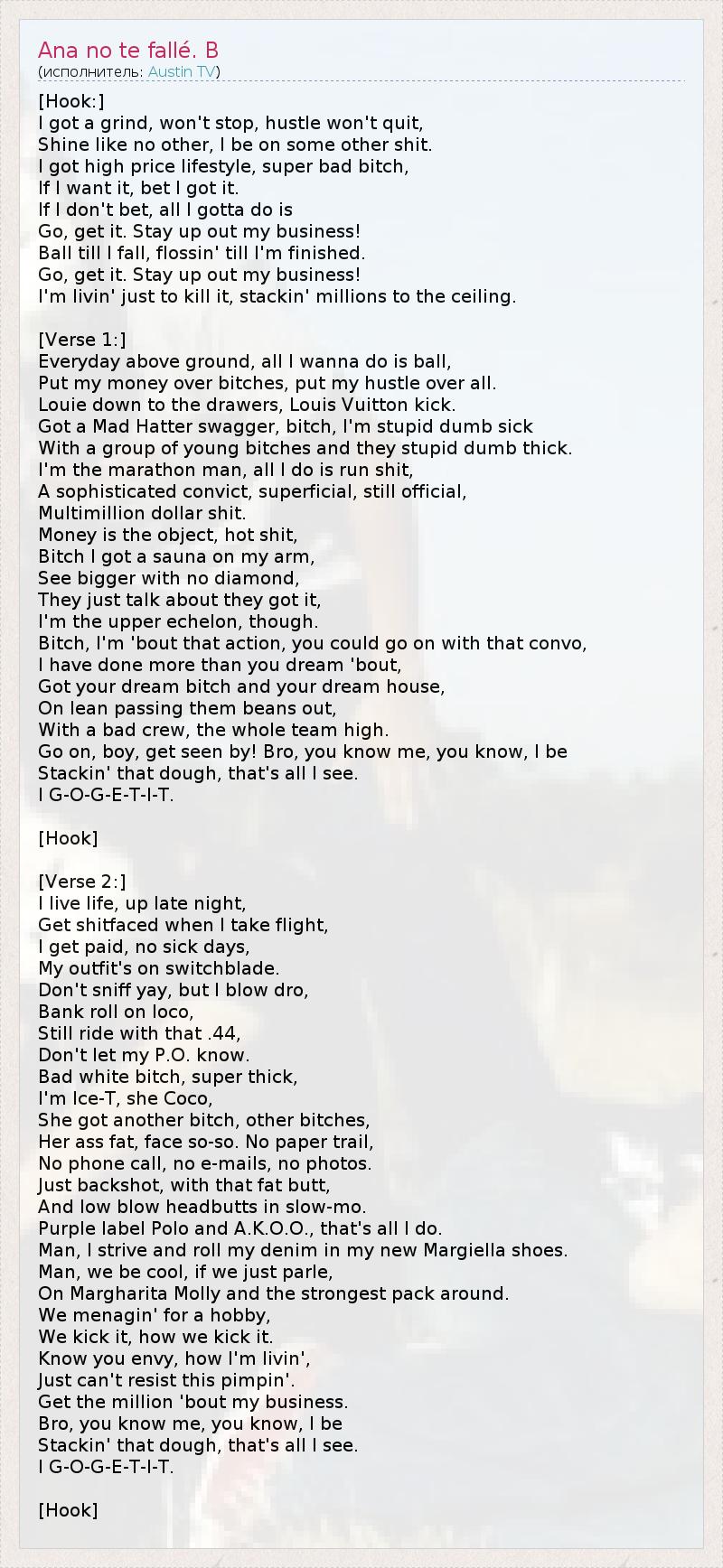 [Хук:] Я тружусь и не остановлюсь, не выйду из игры, Сияю, как никто иной, я в совершенно ином измерении. Веду дорогостоящую жизнь, сверхразвратная шл*ха, Если мне чего-то захочется, бьюсь об заклад, у меня это уже есть. А если я не уверен, то всё, что нужно - Пойти и взять это. Держись подальше от моих дел! Блистаю, пока не потерпел поражение, рисуюсь, пока не выдохнусь. Иди и возьми это. Держись подальше от моих дел! Цель жизни - прожигать её, набит миллионами до потолка. [Куплет 1:] Каждый день, что ещё хожу по Земле, всё, чего я хочу - выделяться, Ставлю деньги превыше бл**ей, ставлю дело превыше всего. Прикинут в Louie 1 вплоть до трусов, кроссовки от Louis Vuitton. Стиль Безумного Шляпника, 2 с**а, я устал до отупения От кучек молодых шалав, чересчур глупых и посредственных. Я марафонец, я имею власть над этой х**нёй, Искушённый з/к, но ещё официальный, наносной, Многомиллионное дер*мо. Деньги - вот цель, срочная и бесповоротная, Шлюха, руки горят, будто из сауны, Я круче, хоть и без бриллиантов, А остальные просто говорят, что они у них есть, Я, блин, из высших эшелонов. С**а, я собираюсь сделать это, а ты можешь продолжать трепаться и дальше, Мои успехи превосходят твои мечты, У меня бл**ь твоей мечты и такой же дом, Пропускаю таблеточки, хоть уже под кайфом, С серьёзными тылами, вся команда навеселе. Давай, пацан, обрати на себя внимание! Братан, ты знаешь меня, ты знаешь, что я буду Накапливать средства, больше я ничего не вижу. И-Д-У-И-Б-Е-Р-У! [Хук] [Куплет 2:] Я живу ярко, не сплю и поздно ночью, Ох**неваю, когда принимаю, Рублю бабло, без тухлых дней, Мой инструмент - финка, Не занюхиваю, но закуриваю, Безумные цифры на банковском счету, Всё ещё езжу с 44 калибром, Моему надзирателю не надо этого знать. Развратная белая шл*шка и очень толстая, Я Ice-T, она Коко, 3 У неё свои с**ки, они другие, У неё жирная зад**ца, а морда так себе. Без переписки, Без звонков, без электронных писем, без фото. Я пристраиваюсь сзади к этой жирной ж*пе, И глубокие минеты в замедленной съёмке. Фиолетовый логотип Polo 4 и A.K.O.O. 5 - вот всё, чем я занимаюсь. Чел, поднатужусь и заправлю джинсы в новые туфли от Margelia. 6 Чел, мы круты даже на расслабоне Под экстази и крепкой травой. Групповушка потехи ради, Мы делаем только так, как мы одни. Знаю, как вы завидуете моей жизни, Я просто не могу устоять перед показухой. Бизнес приносит мне миллионы. Братан, ты знаешь меня, ты знаешь, что я буду Накапливать средства, больше я ничего не вижу. И-Д-У-И-Б-Е-Р-У! [Хук] 1 - Французский дом моды, специализирующийся на производстве чемоданов и сумок, модной одежды и аксессуаров класса "люкс" под одноимённой торговой маркой. 2 - Суперзлодей из вселенной DC Comics, враг Бэтмена. 3 - Ice-T - псевдоним Трэйси Марроу, рэппера, актёра и автора, обладателя наград Grammy Award и NAACP Image Award, известного как исполнитель гангста-рэпа в конце 1980-х. В начале 2005 года Ice-T женился на модели Николь "Коко-Мэри" Остин. 4 - Американская марка одежды. 5 - "A King Of Oneself" - марка одежды от T.I. и Джейсона Гетера. 6 - Мартин Маргелия - бельгийский дизайнер одежды.