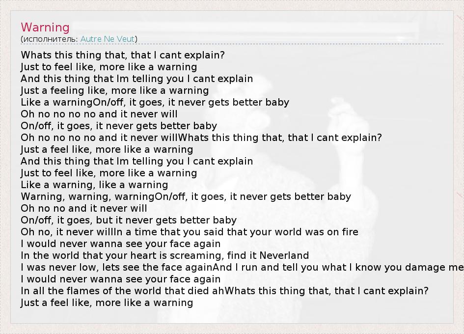Whats this thing that, that I cant explain? Just to feel like, more like a warning And this thing that Im telling you I cant explain Just a feeling like, more like a warning Like a warningOn/off, it goes, it never gets better baby Oh no no no no and it never will On/off, it goes, it never gets better baby Oh no no no no and it never willWhats this thing that, that I cant explain? Just a feel like, more like a warning And this thing that Im telling you I cant explain Just to feel like, more like a warning Like a warning, like a warning Warning, warning, warningOn/off, it goes, it never gets better baby Oh no no and it never will On/off, it goes, but it never gets better baby Oh no, it never willIn a time that you said that your world was on fire I would never wanna see your face again In the world that your heart is screaming, find it Neverland I was never low, lets see the face againAnd I run and tell you what I know you damage me I would never wanna see your face again In all the flames of the world that died ahWhats this thing that, that I cant explain? Just a feel like, more like a warning