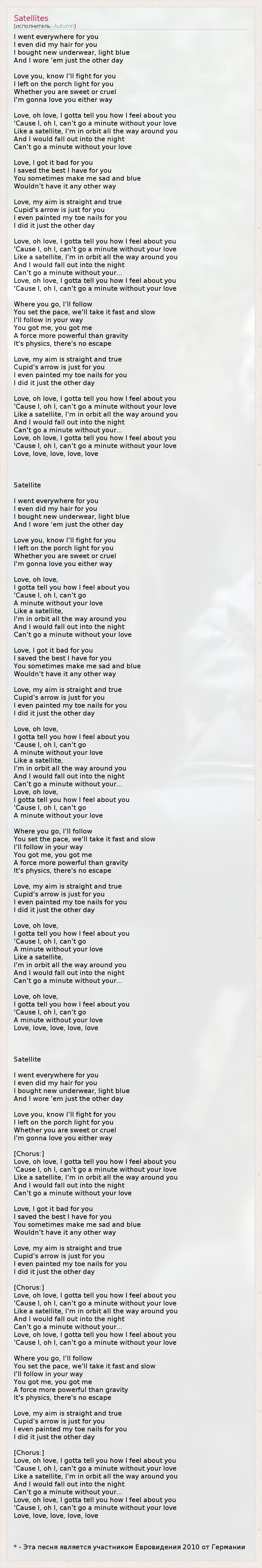 I went everywhere for you I even did my hair for you I bought new underwear, light blue And I wore 'em just the other day Love you, know I'll fight for you I left on the porch light for you Whether you are sweet or cruel I'm gonna love you either way Love, oh love, I gotta tell you how I feel about you 'Cause I, oh I, can't go a minute without your love Like a satellite, I'm in orbit all the way around you And I would fall out into the night Can't go a minute without your love Love, I got it bad for you I saved the best I have for you You sometimes make me sad and blue Wouldn't have it any other way Love, my aim is straight and true Cupid's arrow is just for you I even painted my toe nails for you I did it just the other day Love, oh love, I gotta tell you how I feel about you 'Cause I, oh I, can't go a minute without your love Like a satellite, I'm in orbit all the way around you And I would fall out into the night Can't go a minute without your... Love, oh love, I gotta tell you how I feel about you 'Cause I, oh I, can't go a minute without your love Where you go, I'll follow You set the pace, we'll take it fast and slow I'll follow in your way You got me, you got me A force more powerful than gravity It's physics, there's no escape Love, my aim is straight and true Cupid's arrow is just for you I even painted my toe nails for you I did it just the other day Love, oh love, I gotta tell you how I feel about you 'Cause I, oh I, can't go a minute without your love Like a satellite, I'm in orbit all the way around you And I would fall out into the night Can't go a minute without your... Love, oh love, I gotta tell you how I feel about you 'Cause I, oh I, can't go a minute without your love Love, love, love, love, love Satellite I went everywhere for you I even did my hair for you I bought new underwear, light blue And I wore 'em just the other day Love you, know I'll fight for you I left on the porch light for you Whether you are sweet or cruel I'm gonna love you either way Love, oh love, I gotta tell you how I feel about you 'Cause I, oh I, can't go A minute without your love Like a satellite, I'm in orbit all the way around you And I would fall out into the night Can't go a minute without your love Love, I got it bad for you I saved the best I have for you You sometimes make me sad and blue Wouldn't have it any other way Love, my aim is straight and true Cupid's arrow is just for you I even painted my toe nails for you I did it just the other day Love, oh love, I gotta tell you how I feel about you 'Cause I, oh I, can't go A minute without your love Like a satellite, I'm in orbit all the way around you And I would fall out into the night Can't go a minute without your... Love, oh love, I gotta tell you how I feel about you 'Cause I, oh I, can't go A minute without your love Where you go, I'll follow You set the pace, we'll take it fast and slow I'll follow in your way You got me, you got me A force more powerful than gravity It's physics, there's no escape Love, my aim is straight and true Cupid's arrow is just for you I even painted my toe nails for you I did it just the other day Love, oh love, I gotta tell you how I feel about you 'Cause I, oh I, can't go A minute without your love Like a satellite, I'm in orbit all the way around you And I would fall out into the night Can't go a minute without your... Love, oh love, I gotta tell you how I feel about you 'Cause I, oh I, can't go A minute without your love Love, love, love, love, love Satellite I went everywhere for you I even did my hair for you I bought new underwear, light blue And I wore 'em just the other day Love you, know I'll fight for you I left on the porch light for you Whether you are sweet or cruel I'm gonna love you either way [Chorus:] Love, oh love, I gotta tell you how I feel about you 'Cause I, oh I, can't go a minute without your love Like a satellite, I'm in orbit all the way around you And I would fall out into the night Can't go a minute without your love Love, I got it bad for you I saved the best I have for you You sometimes make me sad and blue Wouldn't have it any other way Love, my aim is straight and true Cupid's arrow is just for you I even painted my toe nails for you I did it just the other day [Chorus:] Love, oh love, I gotta tell you how I feel about you 'Cause I, oh I, can't go a minute without your love Like a satellite, I'm in orbit all the way around you And I would fall out into the night Can't go a minute without your... Love, oh love, I gotta tell you how I feel about you 'Cause I, oh I, can't go a minute without your love Where you go, I'll follow You set the pace, we'll take it fast and slow I'll follow in your way You got me, you got me A force more powerful than gravity It's physics, there's no escape Love, my aim is straight and true Cupid's arrow is just for you I even painted my toe nails for you I did it just the other day [Chorus:] Love, oh love, I gotta tell you how I feel about you 'Cause I, oh I, can't go a minute without your love Like a satellite, I'm in orbit all the way around you And I would fall out into the night Can't go a minute without your... Love, oh love, I gotta tell you how I feel about you 'Cause I, oh I, can't go a minute without your love Love, love, love, love, love * - Эта песня является участником Евровидения 2010 от Германии