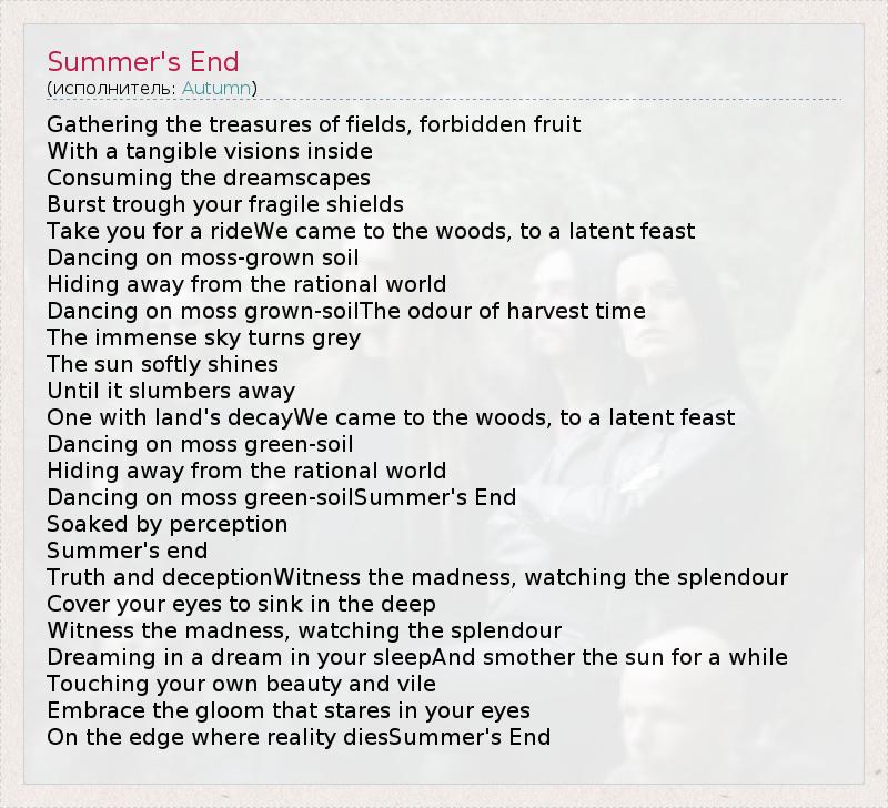 Gathering the treasures of fields, forbidden fruit With a tangible visions inside Consuming the dreamscapes Burst trough your fragile shields Take you for a rideWe came to the woods, to a latent feast Dancing on moss-grown soil Hiding away from the rational world Dancing on moss grown-soilThe odour of harvest time The immense sky turns grey The sun softly shines Until it slumbers away One with land's decayWe came to the woods, to a latent feast Dancing on moss green-soil Hiding away from the rational world Dancing on moss green-soilSummer's End Soaked by perception Summer's end Truth and deceptionWitness the madness, watching the splendour Cover your eyes to sink in the deep Witness the madness, watching the splendour Dreaming in a dream in your sleepAnd smother the sun for a while Touching your own beauty and vile Embrace the gloom that stares in your eyes On the edge where reality diesSummer's End