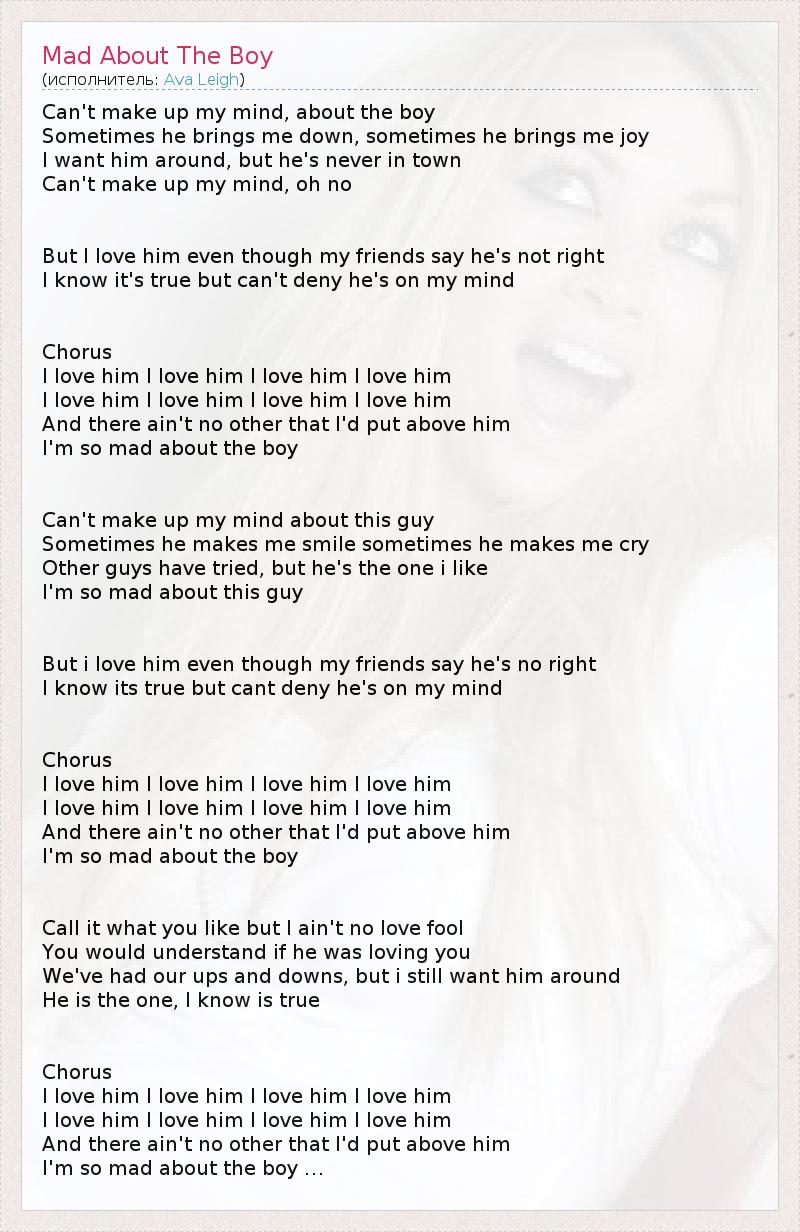 Can't make up my mind, about the boy Sometimes he brings me down, sometimes he brings me joy I want him around, but he's never in town Can't make up my mind, oh no But I love him even though my friends say he's not right I know it's true but can't deny he's on my mind Chorus I love him I love him I love him I love him I love him I love him I love him I love him And there ain't no other that I'd put above him I'm so mad about the boy Can't make up my mind about this guy Sometimes he makes me smile sometimes he makes me cry Other guys have tried, but he's the one i like I'm so mad about this guy But i love him even though my friends say he's no right I know its true but cant deny he's on my mind Chorus I love him I love him I love him I love him I love him I love him I love him I love him And there ain't no other that I'd put above him I'm so mad about the boy Call it what you like but I ain't no love fool You would understand if he was loving you We've had our ups and downs, but i still want him around He is the one, I know is true Chorus I love him I love him I love him I love him I love him I love him I love him I love him And there ain't no other that I'd put above him I'm so mad about the boy …