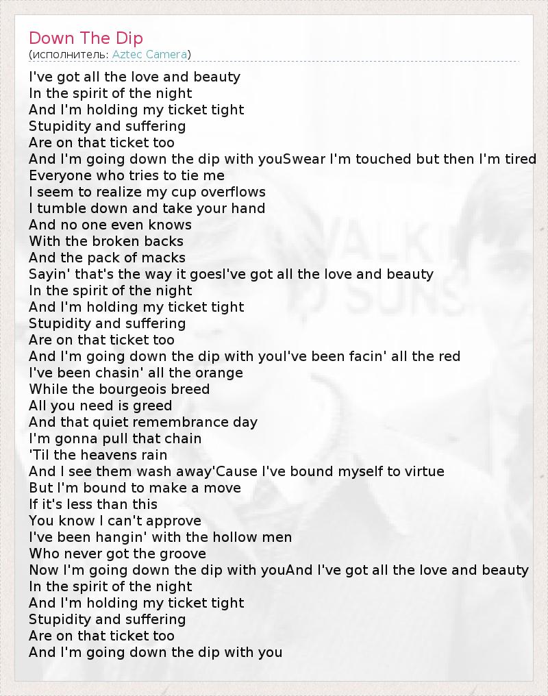 Now I'm going down the dip with youAnd I've got all the love and beauty