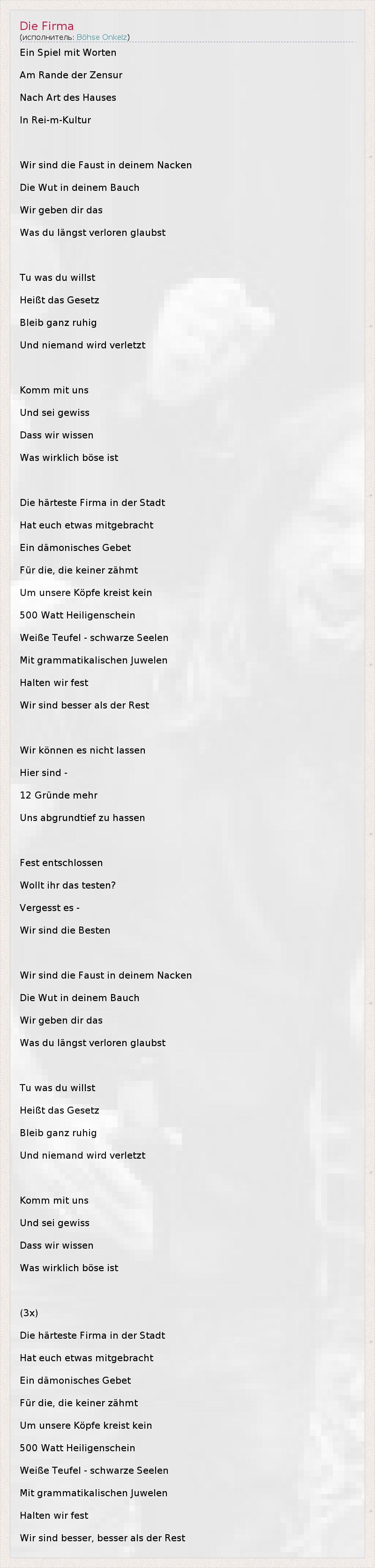 Ein Spiel mit Worten Am Rande der Zensur Nach Art des Hauses In Rei-m-Kultur Wir sind die Faust in deinem Nacken Die Wut in deinem Bauch Wir geben dir das Was du längst verloren glaubst Tu was du willst Heißt das Gesetz Bleib ganz ruhig Und niemand wird verletzt Komm mit uns Und sei gewiss Dass wir wissen Was wirklich böse ist Die härteste Firma in der Stadt Hat euch etwas mitgebracht Ein dämonisches Gebet Für die, die keiner zähmt Um unsere Köpfe kreist kein 500 Watt Heiligenschein Weiße Teufel - schwarze Seelen Mit grammatikalischen Juwelen Halten wir fest Wir sind besser als der Rest Wir können es nicht lassen Hier sind - 12 Gründe mehr Uns abgrundtief zu hassen Fest entschlossen Wollt ihr das testen? Vergesst es - Wir sind die Besten Wir sind die Faust in deinem Nacken Die Wut in deinem Bauch Wir geben dir das Was du längst verloren glaubst Tu was du willst Heißt das Gesetz Bleib ganz ruhig Und niemand wird verletzt Komm mit uns Und sei gewiss Dass wir wissen Was wirklich böse ist (3x) Die härteste Firma in der Stadt Hat euch etwas mitgebracht Ein dämonisches Gebet Für die, die keiner zähmt Um unsere Köpfe kreist kein 500 Watt Heiligenschein Weiße Teufel - schwarze Seelen Mit grammatikalischen Juwelen Halten wir fest Wir sind besser, besser als der Rest
