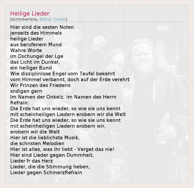Hier sind die sesten Noten jenseits des Himmels heilige Lieder aus berufenem Mund Wahre Worte im Dschungel der Lge das Licht im Dunkel, ein heiliger Bund Wie disziplinlose Engel vom Teufel bekehrt vom Himmel verbannt, doch auf der Erde verehrt Wir Prinzen des Friedens sndigen gern Im Namen der Onkelz, im Namen des Herrn Refrain: Die Erde hat uns wieder, so wie sie uns kennt mit scheinheiligen Liedern erobern wir die Welt Die Erde hat uns wieder, so wie sie uns kennt mit scheinheiligen Liedern erobern wir, erobern wir die Welt Hier ist die lieblichste Musik, die schnsten Melodien Hier ist alles, was ihr liebt - Verget das nie! Hier sind Lieder gegen Dummheit, Lieder fr das Herz Lieder, die die Stimmung heben, Lieder gegen SchmerzRefrain