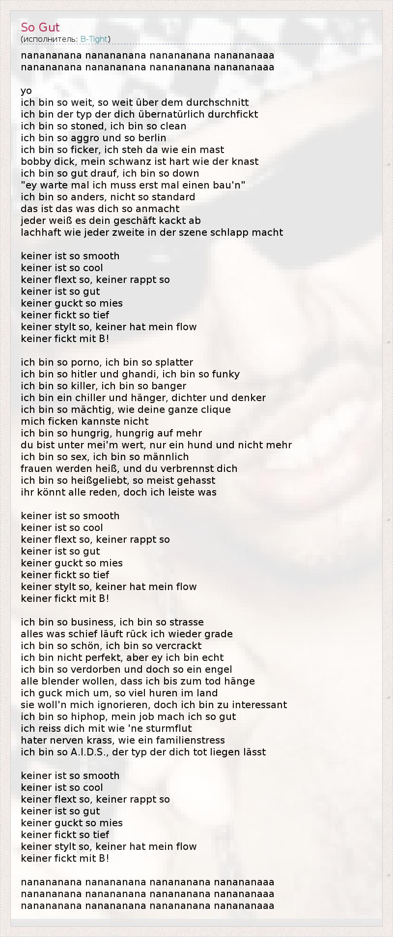 nanananana nanananana nanananana nanananaaa nanananana nanananana nanananana nanananaaa yo ich bin so weit, so weit über dem durchschnitt ich bin der typ der dich übernatürlich durchfickt ich bin so stoned, ich bin so clean ich bin so aggro und so berlin ich bin so ficker, ich steh da wie ein mast bobby dick, mein schwanz ist hart wie der knast ich bin so gut drauf, ich bin so down "ey warte mal ich muss erst mal einen bau'n" ich bin so anders, nicht so standard das ist das was dich so anmacht jeder weiß es dein geschäft kackt ab lachhaft wie jeder zweite in der szene schlapp macht keiner ist so smooth keiner ist so cool keiner flext so, keiner rappt so keiner ist so gut keiner guckt so mies keiner fickt so tief keiner stylt so, keiner hat mein flow keiner fickt mit B! ich bin so porno, ich bin so splatter ich bin so hitler und ghandi, ich bin so funky ich bin so killer, ich bin so banger ich bin ein chiller und hänger, dichter und denker ich bin so mächtig, wie deine ganze clique mich ficken kannste nicht ich bin so hungrig, hungrig auf mehr du bist unter mei'm wert, nur ein hund und nicht mehr ich bin so sex, ich bin so männlich frauen werden heiß, und du verbrennst dich ich bin so heißgeliebt, so meist gehasst ihr könnt alle reden, doch ich leiste was keiner ist so smooth keiner ist so cool keiner flext so, keiner rappt so keiner ist so gut keiner guckt so mies keiner fickt so tief keiner stylt so, keiner hat mein flow keiner fickt mit B! ich bin so business, ich bin so strasse alles was schief läuft rück ich wieder grade ich bin so schön, ich bin so vercrackt ich bin nicht perfekt, aber ey ich bin echt ich bin so verdorben und doch so ein engel alle blender wollen, dass ich bis zum tod hänge ich guck mich um, so viel huren im land sie woll'n mich ignorieren, doch ich bin zu interessant ich bin so hiphop, mein job mach ich so gut ich reiss dich mit wie 'ne sturmflut hater nerven krass, wie ein familienstress ich bin so A.I.D.S., der typ der dich tot liegen lässt keiner ist so smooth keiner ist so cool keiner flext so, keiner rappt so keiner ist so gut keiner guckt so mies keiner fickt so tief keiner stylt so, keiner hat mein flow keiner fickt mit B! nanananana nanananana nanananana nanananaaa nanananana nanananana nanananana nanananaaa nanananana nanananana nanananana nanananaaa