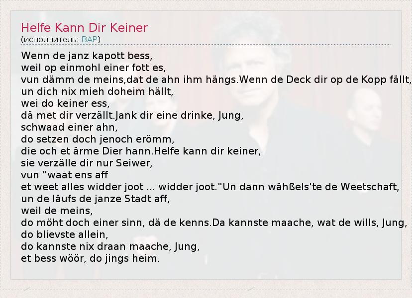 Wenn de janz kapott bess, weil op einmohl einer fott es, vun dämm de meins,dat de ahn ihm hängs.Wenn de Deck dir op de Kopp fällt, un dich nix mieh doheim hällt, wei do keiner ess, dä met dir verzällt.Jank dir eine drinke, Jung, schwaad einer ahn, do setzen doch jenoch erömm, die och et ärme Dier hann.Helfe kann dir keiner, sie verzälle dir nur Seiwer, vun "waat ens aff et weet alles widder joot ... widder joot."Un dann wähßels'te de Weetschaft, un de läufs de janze Stadt aff, weil de meins, do möht doch einer sinn, dä de kenns.Da kannste maache, wat de wills, Jung, do blievste allein, do kannste nix draan maache, Jung, et bess wöör, do jings heim.