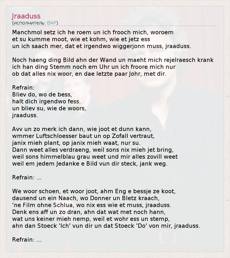 Manchmol setz ich he roem un ich frooch mich, woroem et su kumme moot, wie et kohm, wie et jetz ess un ich saach mer, dat et irgendwo wiggerjonn muss, jraaduss. Noch haeng ding Bild ahn der Wand un maeht mich rejelraesch krank ich han ding Stemm noch em Uhr un ich froore mich nur ob dat alles nix woor, en dae letzte paar Johr, met dir. Refrain: Bliev do, wo de bess, halt dich irgendwo fess. un bliev su, wie de woors, jraaduss. Avv un zo merk ich dann, wie joot et dunn kann, wmmer Luftschloesser baut un op Zofall vertraut, janix mieh plant, op janix mieh waat, nur su. Dann weet alles verdraeng, weil sons nix mieh jet bring, weil sons himmelblau grau weet und mir alles zovill weet weil em jedem Jedanke e Bild vun dir steck, jank weg. Refrain: ... We woor schoen, et woor joot, ahm Eng e bessje ze koot, dausend un ein Naach, wo Donner un Bletz kraach, 'ne Film ohne Schlua, wo nix ess wie et muss, jraaduss. Denk ens aff un zo dran, ahn dat wat met noch hann, wat uns keiner mieh nemp, weil et wohr ess un stemp, ahn dan Stoeck 'Ich' vun dir un dat Stoeck 'Do' von mir, jraaduss. Refrain: ...