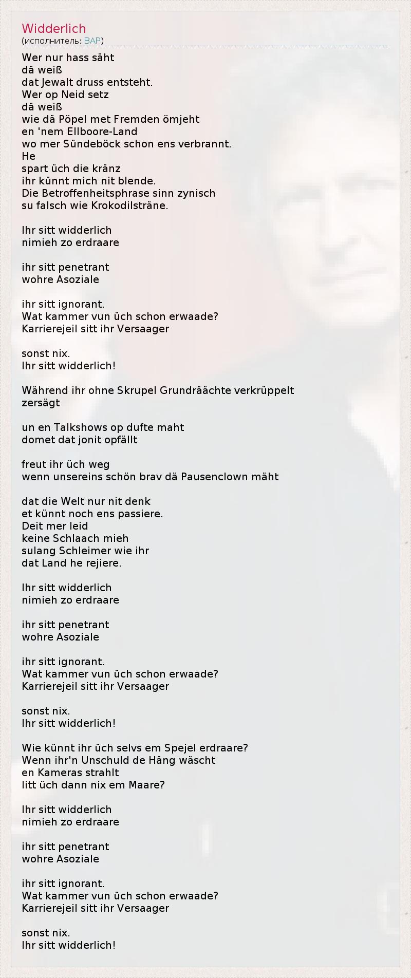 Wer nur hass säht dä weiß dat Jewalt druss entsteht. Wer op Neid setz dä weiß wie dä Pöpel met Fremden ömjeht en 'nem Ellboore-Land wo mer Sündeböck schon ens verbrannt. He spart üch die kränz ihr künnt mich nit blende. Die Betroffenheitsphrase sinn zynisch su falsch wie Krokodilsträne. Ihr sitt widderlich nimieh zo erdraare ihr sitt penetrant wohre Asoziale ihr sitt ignorant. Wat kammer vun üch schon erwaade? Karrierejeil sitt ihr Versaager sonst nix. Ihr sitt widderlich! Während ihr ohne Skrupel Grundräächte verkrüppelt zersägt un en Talkshows op dufte maht domet dat jonit opfällt freut ihr üch weg wenn unsereins schön brav dä Pausenclown mäht dat die Welt nur nit denk et künnt noch ens passiere. Deit mer leid keine Schlaach mieh sulang Schleimer wie ihr dat Land he rejiere. Ihr sitt widderlich nimieh zo erdraare ihr sitt penetrant wohre Asoziale ihr sitt ignorant. Wat kammer vun üch schon erwaade? Karrierejeil sitt ihr Versaager sonst nix. Ihr sitt widderlich! Wie künnt ihr üch selvs em Spejel erdraare? Wenn ihr'n Unschuld de Häng wäscht en Kameras strahlt litt üch dann nix em Maare? Ihr sitt widderlich nimieh zo erdraare ihr sitt penetrant wohre Asoziale ihr sitt ignorant. Wat kammer vun üch schon erwaade? Karrierejeil sitt ihr Versaager sonst nix. Ihr sitt widderlich!