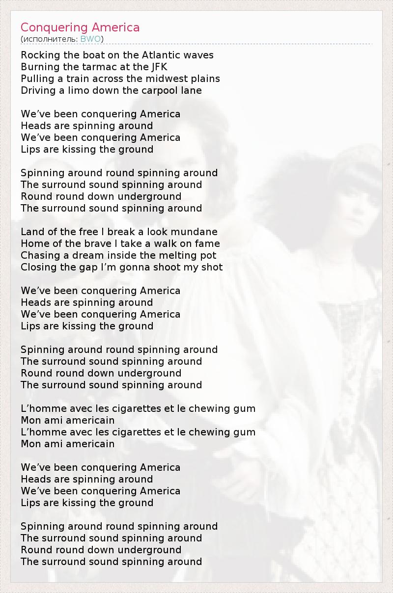 Rocking the boat on the Atlantic waves Burning the tarmac at the JFK Pulling a train across the midwest plains Driving a limo down the carpool lane We’ve been conquering America Heads are spinning around We’ve been conquering America Lips are kissing the ground Spinning around round spinning around The surround sound spinning around Round round down underground The surround sound spinning around Land of the free I break a look mundane Home of the brave I take a walk on fame Chasing a dream inside the melting pot Closing the gap I’m gonna shoot my shot We’ve been conquering America Heads are spinning around We’ve been conquering America Lips are kissing the ground Spinning around round spinning around The surround sound spinning around Round round down underground The surround sound spinning around L’homme avec les cigarettes et le chewing gum Mon ami americain L’homme avec les cigarettes et le chewing gum Mon ami americain We’ve been conquering America Heads are spinning around We’ve been conquering America Lips are kissing the ground Spinning around round spinning around The surround sound spinning around Round round down underground The surround sound spinning around