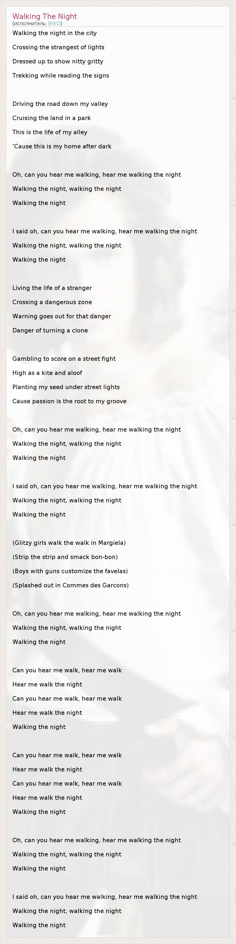 Walking the night in the city Crossing the strangest of lights Dressed up to show nitty gritty Trekking while reading the signs Driving the road down my valley Cruising the land in a park This is the life of my alley 'Cause this is my home after dark Oh, can you hear me walking, hear me walking the night Walking the night, walking the night Walking the night I said oh, can you hear me walking, hear me walking the night Walking the night, walking the night Walking the night Living the life of a stranger Crossing a dangerous zone Warning goes out for that danger Danger of turning a clone Gambling to score on a street fight High as a kite and aloof Planting my seed under street lights Cause passion is the root to my groove Oh, can you hear me walking, hear me walking the night Walking the night, walking the night Walking the night I said oh, can you hear me walking, hear me walking the night Walking the night, walking the night Walking the night (Glitzy girls walk the walk in Margiela) (Strip the strip and smack bon-bon) (Boys with guns customize the favelas) (Splashed out in Commes des Garcons) Oh, can you hear me walking, hear me walking the night Walking the night, walking the night Walking the night Can you hear me walk, hear me walk Hear me walk the night Can you hear me walk, hear me walk Hear me walk the night Walking the night Can you hear me walk, hear me walk Hear me walk the night Can you hear me walk, hear me walk Hear me walk the night Walking the night Oh, can you hear me walking, hear me walking the night Walking the night, walking the night Walking the night I said oh, can you hear me walking, hear me walking the night Walking the night, walking the night Walking the night